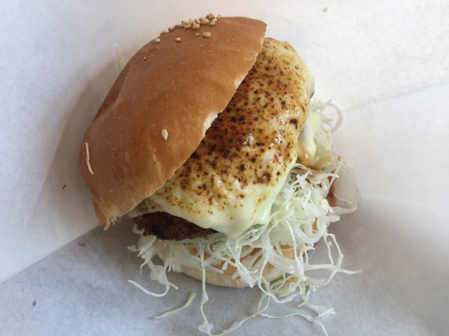 バンズの上にキャベツの千切りがあり、その上に1cmくらいの厚さの豚メンチカツがあり、豚メンチカツ上にこがしたチーズがのっていて、少し甘みのあるソースがかかったバーガーなので、第一印象としては、ボリュームを感じました。
