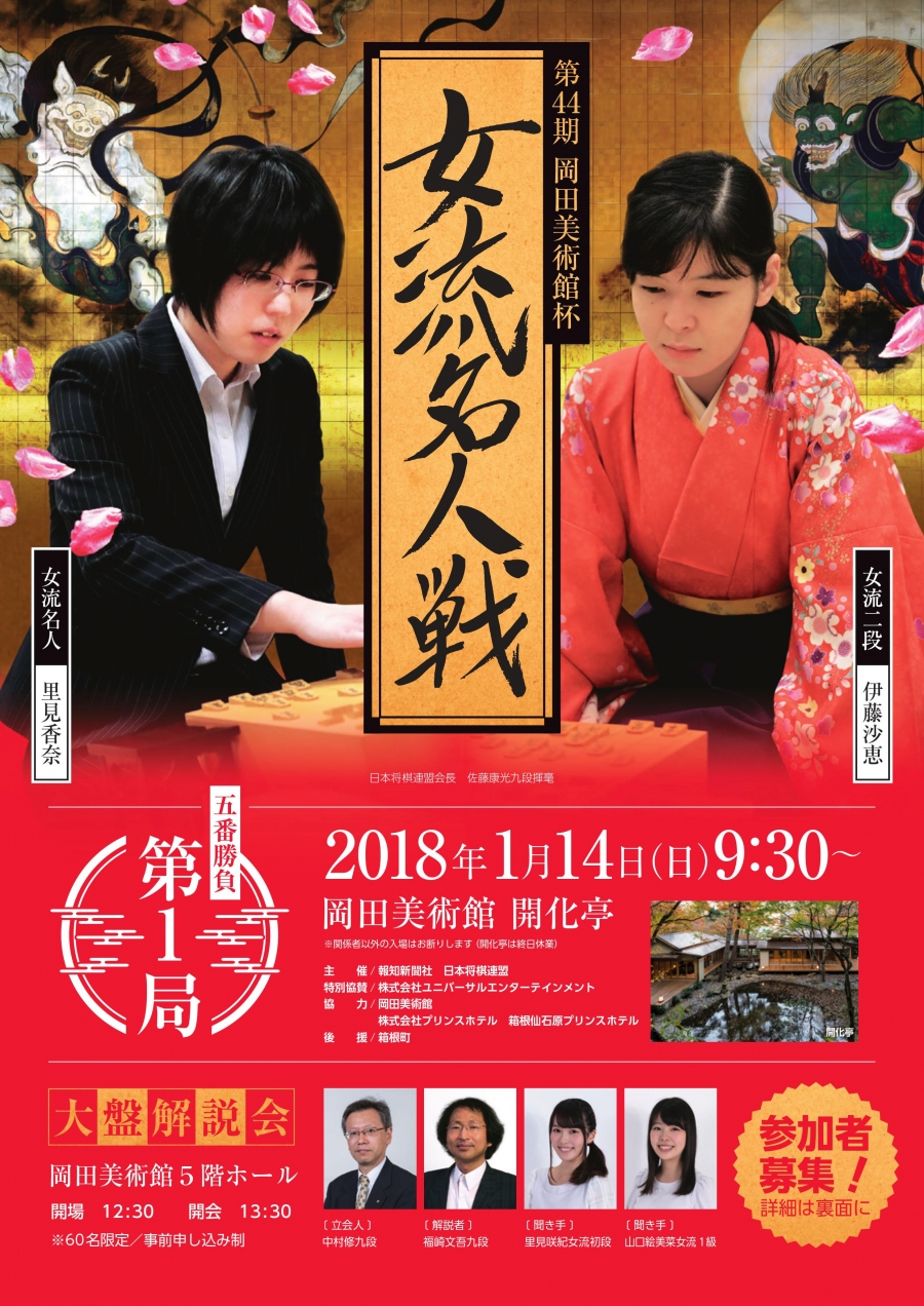 岡田美術館では、2018年1月14日(日)、将棋の第44期岡田美術館杯 女流名人戦五番勝負 第1局(里見香奈女流名人 対 伊藤沙恵女流二段)を開催いたします。つきましては、大盤解説会の一般参加の方を募集いたします。ぜひ、お立ち会いください。