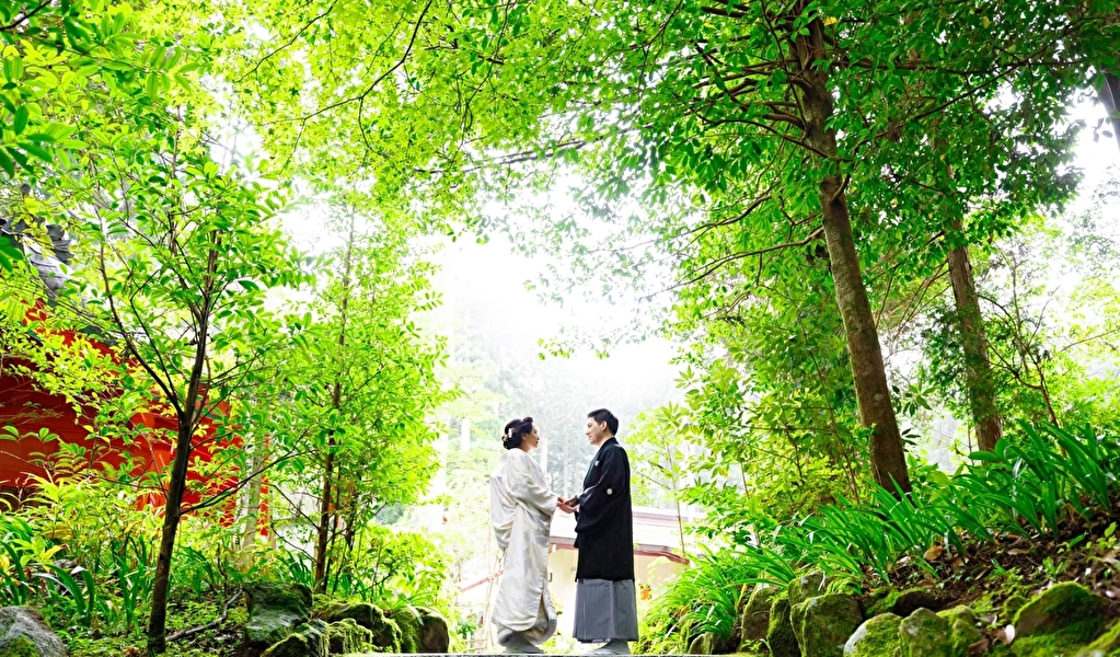 地域全体がパワースポットとしても有名な箱根。特に芦ノ湖は、多くの神々が宿っていると古くから言い伝えられており、それを祭った神社が多く存在します。箱根神社はその中でも多くに御神木がそびえ強いパワーを持つ神社のひとつと言われています。雄大な芦ノ湖の景色を堪能しながら、1200有余年の歴史を感じさせる雰囲気の中での結婚式は、おふたりのご家族の絆を強く固く結んでくれることでしょう。また、箱根神社の挙式後は、箱根の温泉旅館で、ゆっくりご家族で過ごす事もおすすめ。美味しいお料理と旅館の心づくしのサービスで、1泊2日の旅館ウェディングを楽しんではいかがでしょうか?