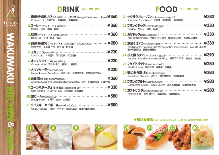 ドリンク:コヒー、カフェオレ、紅茶、コーンポタージュ、ソフトドリンク各種、生ビール フード :カレーパン、フランクドッグ、カツドック、フランクフルト、から揚げ各種