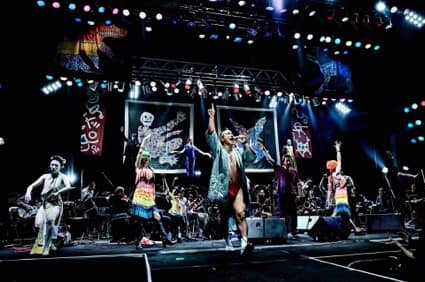 不破大輔を中心とするビッグバンド「渋さ知らズオーケストラ」。音楽だけではなく、ダンサーや舞踊家、舞台役者など、総勢30ほどのメンバーが、「渋さ知らズ自らズ」がデザインした特設テントで演奏する「天幕渋さ」とよばれる公演です。