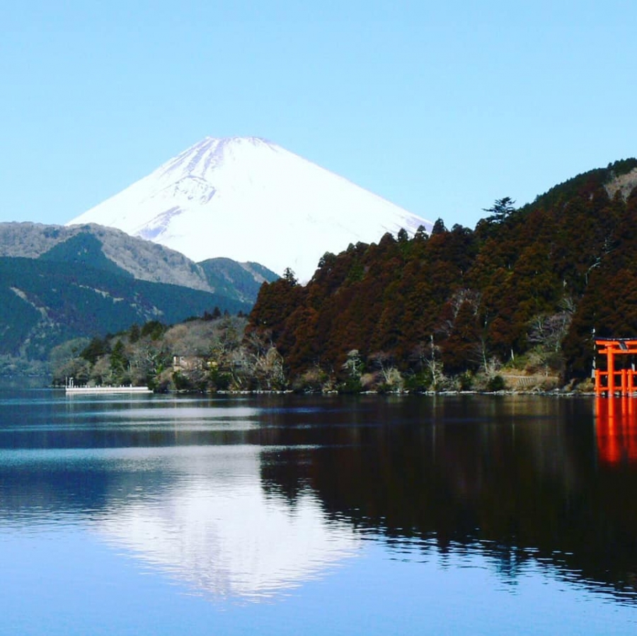 “箱根成川美術館”から見られる芦ノ湖に浮かぶ平和の鳥居その向こうには富士山の光景は箱根を象徴する景色としても有名です。