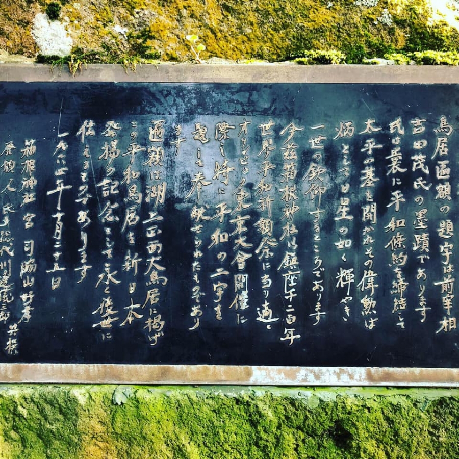 また、この鳥居には「平和」と書かれた額が湖に向かって掲げられており、陸からは見えないためなかなか見ることができないのですがこれは、1964年(昭和39年)、箱根大神(ハコネノオオカミ)御鎮座1200年と東京オリンピック開催を奉祝記念し、「平和」の扁額が掲げられました。