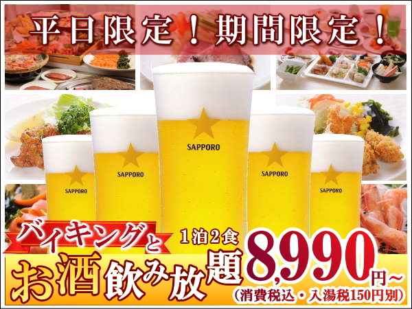 で夕食バイキングにお酒飲み放題90分(18:00~19:30の時間指定)が