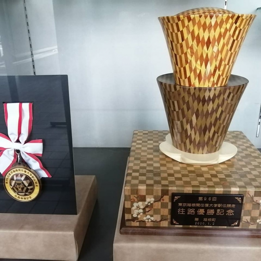 また、毎年恒例でもあります、往路優勝校に贈られる寄木細工のトロフィー(金指ウッドクラフトの金指勝悦さんが制作されています)ですが、今回のテーマは「平成から令和へ」です。