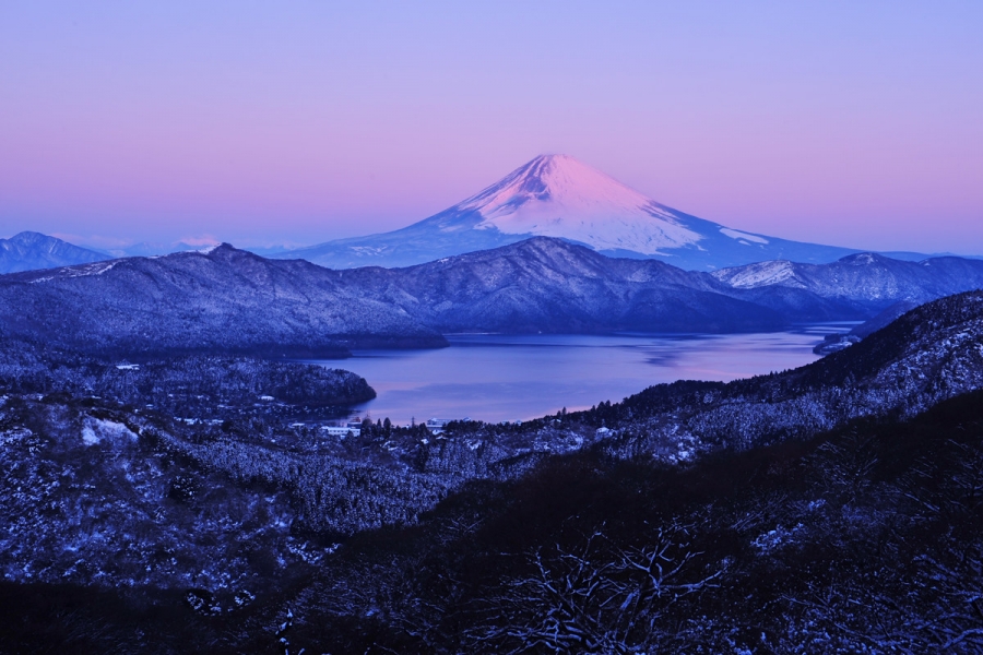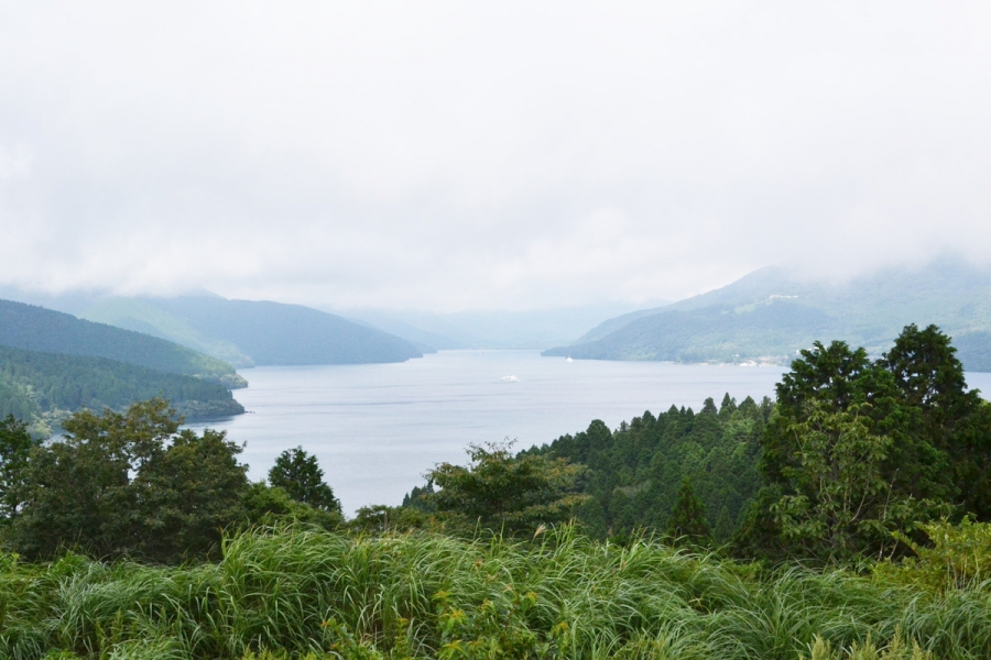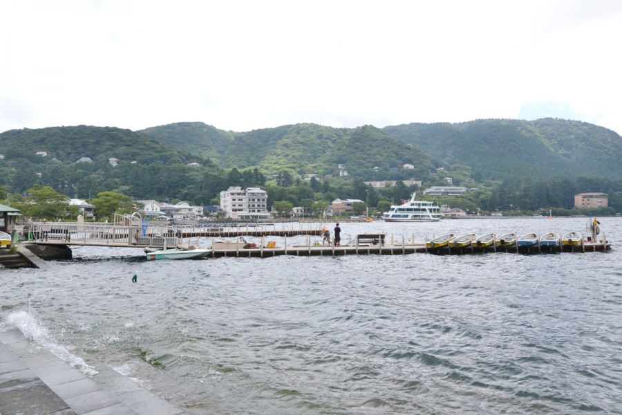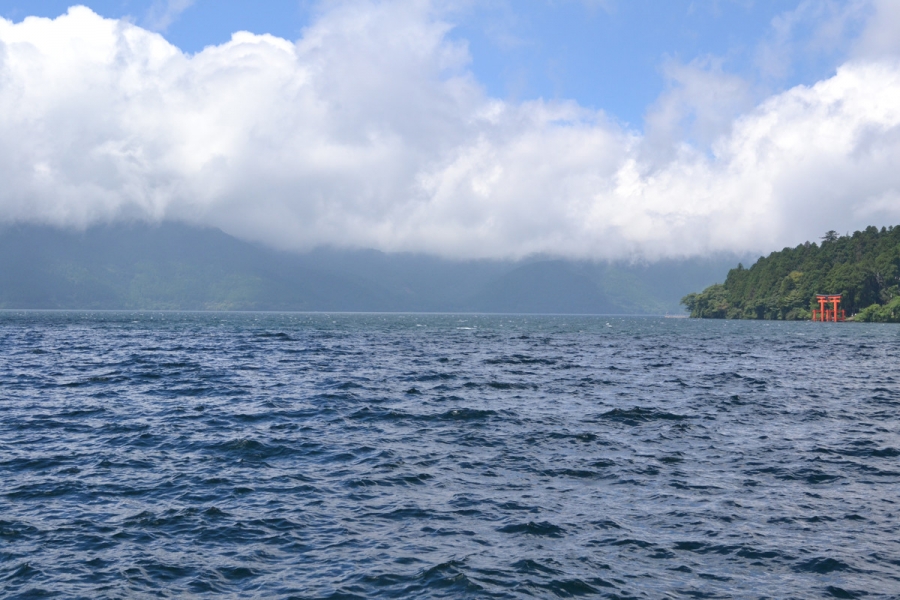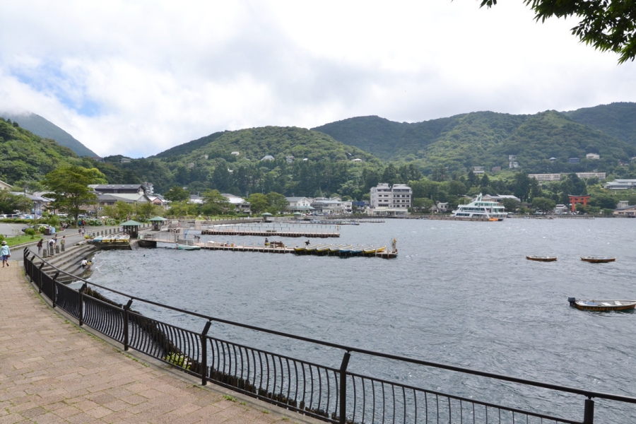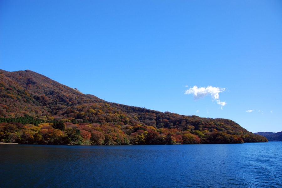 約40万年前に箱根火山のカルデラの中にできた周囲約20kmの細長い湖。南岸の杉並木街道から眺める「逆さ富士」は、箱根の絶景の一つに数えられています。湖上から観る景観もまた格別です。また水温は1年通じて4℃以上あり、真冬でも凍結することがなく「熱帯湖」となっています。