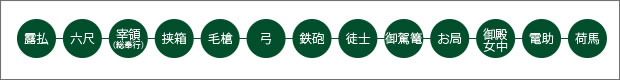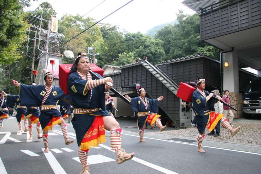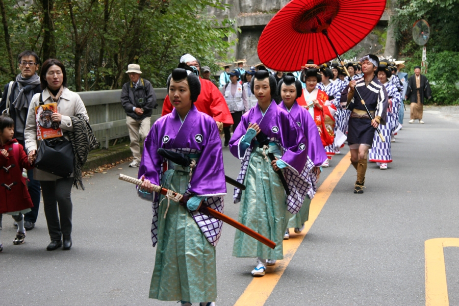 これは、大名行列に一回の華やかさを加える観光行事として、大目に見てほしいと思う。この行列の花形である挟箱について、「鋏が入っているのですか」という質問をよく受けるが、これは本来は衣類を入れる箱である。昔は竹を割って衣類を挟み、挟竹として用いたところから、衣類を持ち運ぶための箱を挟箱というようになったといわれている。毛槍は祭礼の鉾にあたるもので、呪術的な意味をもつといわれている。奴の掛け声である「ヒーハーヒー」「エーヤットマカセ」「ヨーヨンヤサササ」の意味は不明だが、「ヒーハーヒー」は、前に記した松田の渋谷は「下に下に」の意ではないかと、話していたという。「ヤットマカセ」は奴振り、奴踊りなどにつく特殊な「はやし詩」で、諸国にあるといわれている。