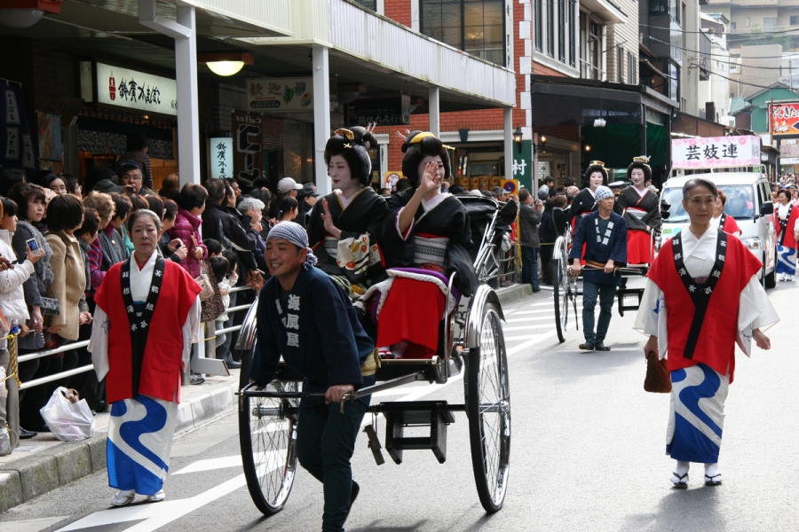 奴に次ぐ人気は、行列の最後を飾る長持担ぎの人足だった。杉崎長人郎・亀次郎の兄弟 が、あの美声で「箱根長持唄(雲助唄)」を披露したものだから、ヤンヤの喝釆を浴びた。杉崎兄弟は既に昭和6年4月、東京の神宮外苑で開かれた第6回郷土舞踊と民謡の会で、そのノドを披露したくらいの名人だったから、沿道の見物客を喜ばせたのも当然だった。唄の文句がいい。「箱根八里は馬でも越すが、越すに越されぬ大井川」を初め、「竹になりたや箱根の竹に、諸国大名の杖竹に≒三島照る照る小田原曇る、あいの関所は雨が降る≒山の荷物は花なら蕾、立場(休憩所)立場で酒酒と(咲け咲けをかけている)」。