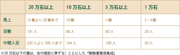 御本城を始め、所々火の番、かねて仰せつけ置かれ侯面々はもちろん、臨時の火消等仰せつけられ侯面々、たとえ20万石以上たりというとも、騎馬20騎に過ぐるべからず。さらに、「所々御門番人数覚え」として、大手御門(15万石以上の譜代大名が守った)給人(馬上の士のこと)20人、侍5人、足軽100人、中間50人。