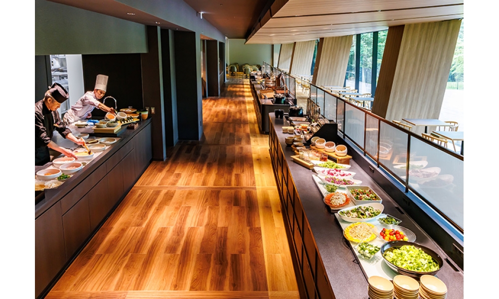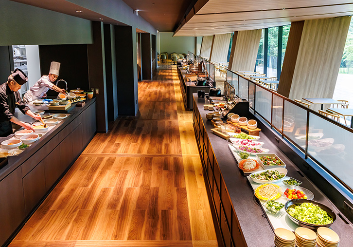 朝食・昼食および夕食(休前日)は多彩な食材を使用したブッフェをご提供。夕食(平日・休日)は米国産の高品質アンガス牛「オーロラビーフ(※1)」を使用したステーキやシーフードグリル、サラダバーなどを取り揃えたア・ラ・カルトメニューをご提供いたします。