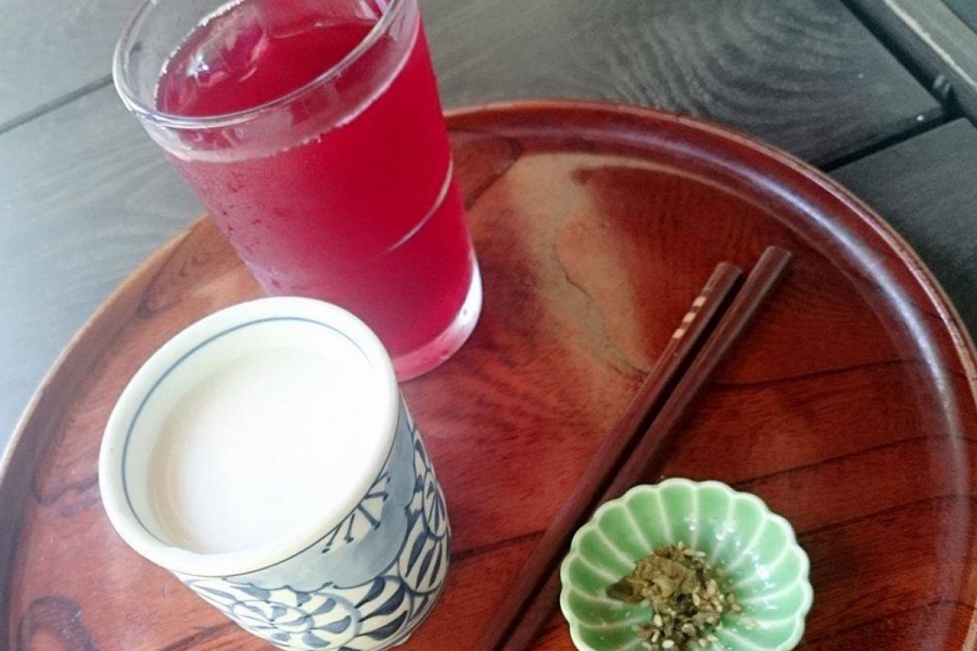 お店の外に姫と殿のカツラがあり少し遊びつつ、店内に入り涼しげなしそジュースを頂きました!