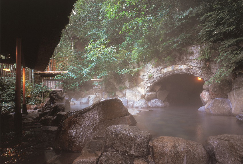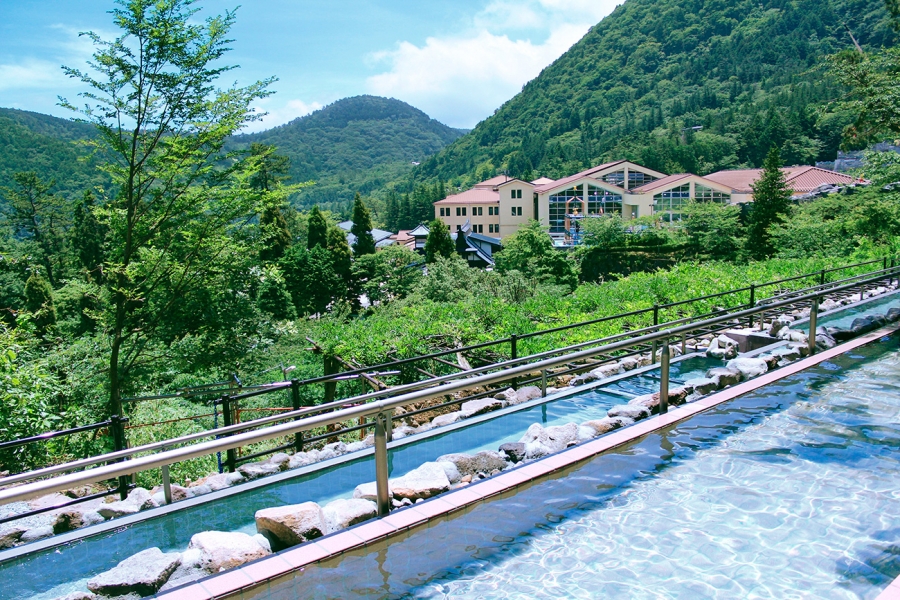 場所は湯坂山の中腹に位置しており、自然の緑に抱かれながら17種類のお風呂をお楽しみ下さい。