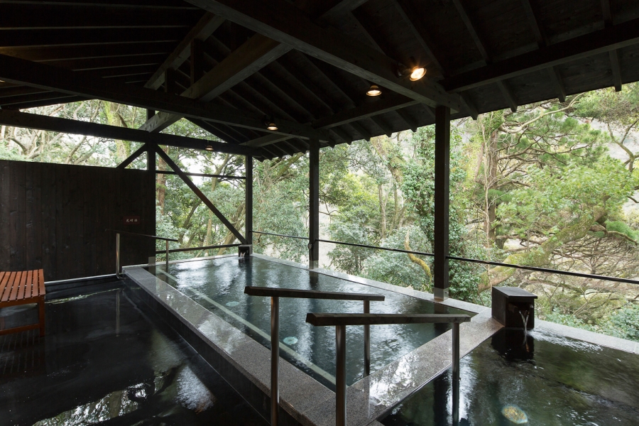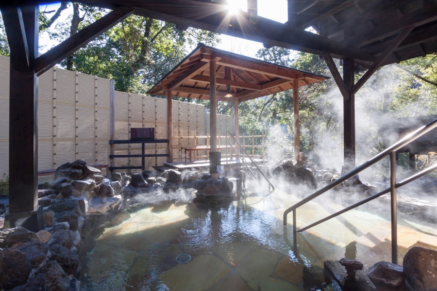 壱ノ巻はプライベート感のある露天風呂、弐ノ巻、参ノ巻からは緑の景色が望めます。大きめの浴槽は、切り石や岩、陶器、羽釜風呂などさまざま。泉質は肌に優しいアルカリ性単純温泉です。