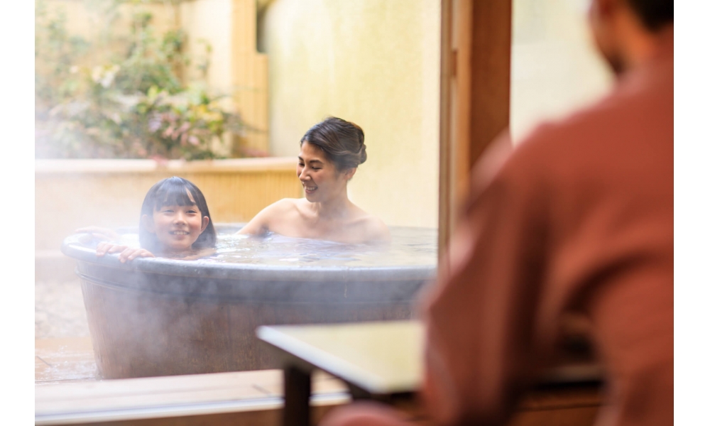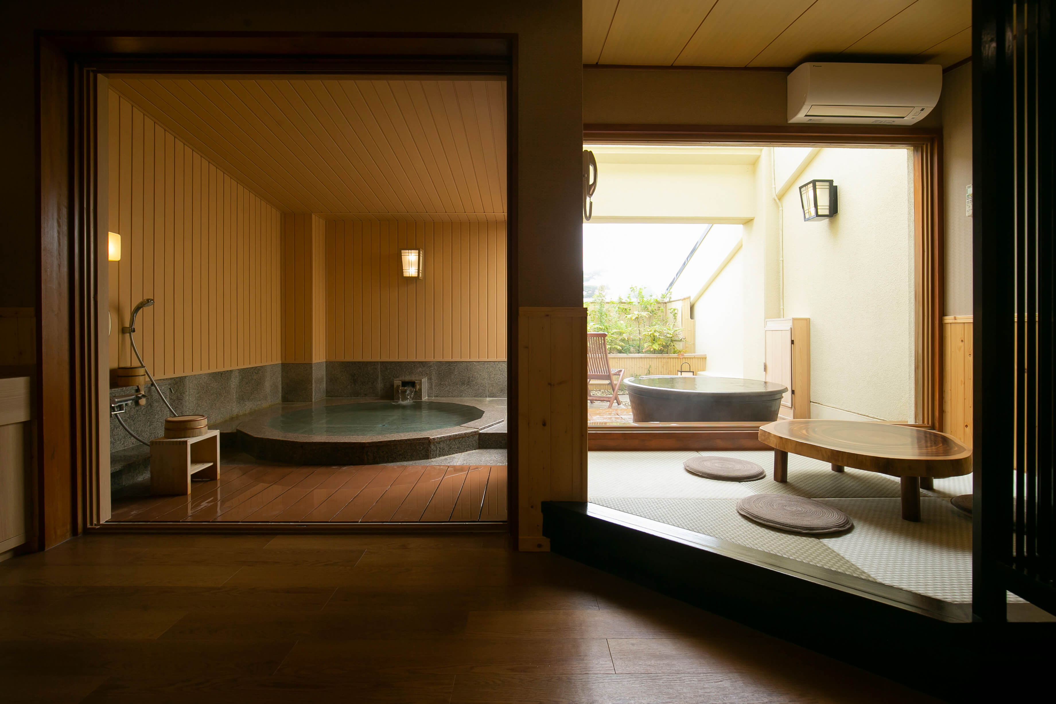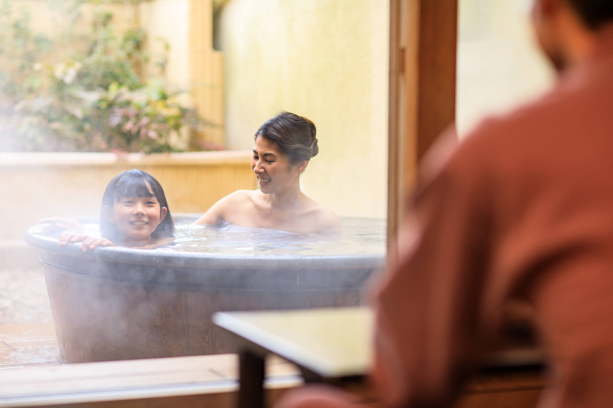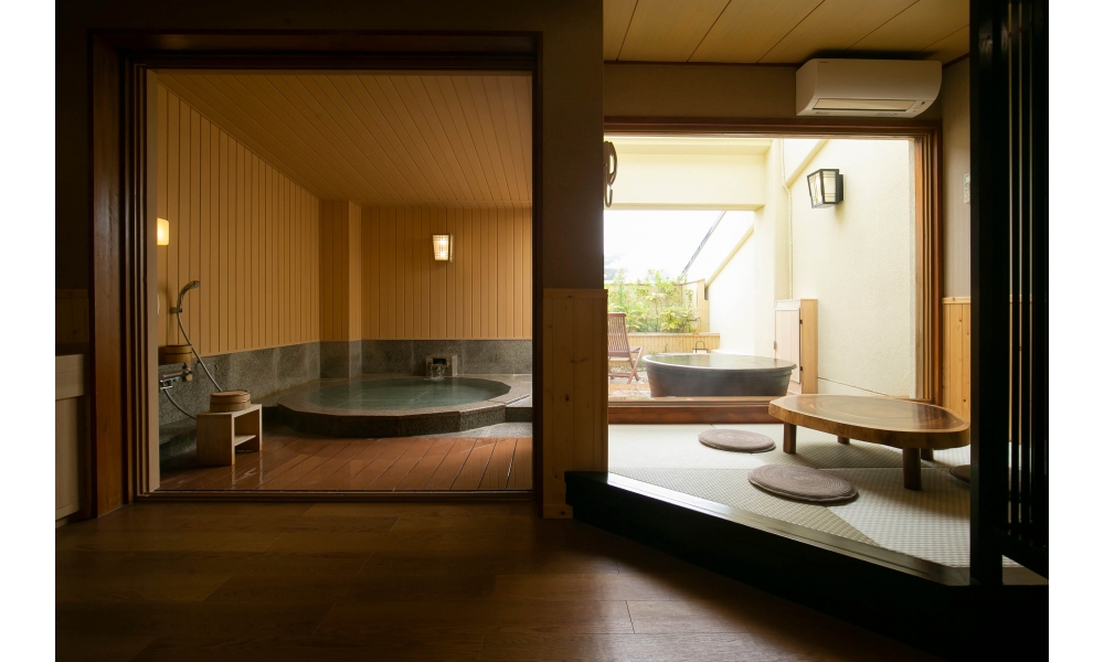 各室には、イスとテーブルのある冷暖房完備の休憩室がついているので、飲み物を飲んだり寛いだり、家族や身近な人と自由に湯あみが愉しめます。