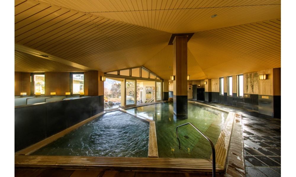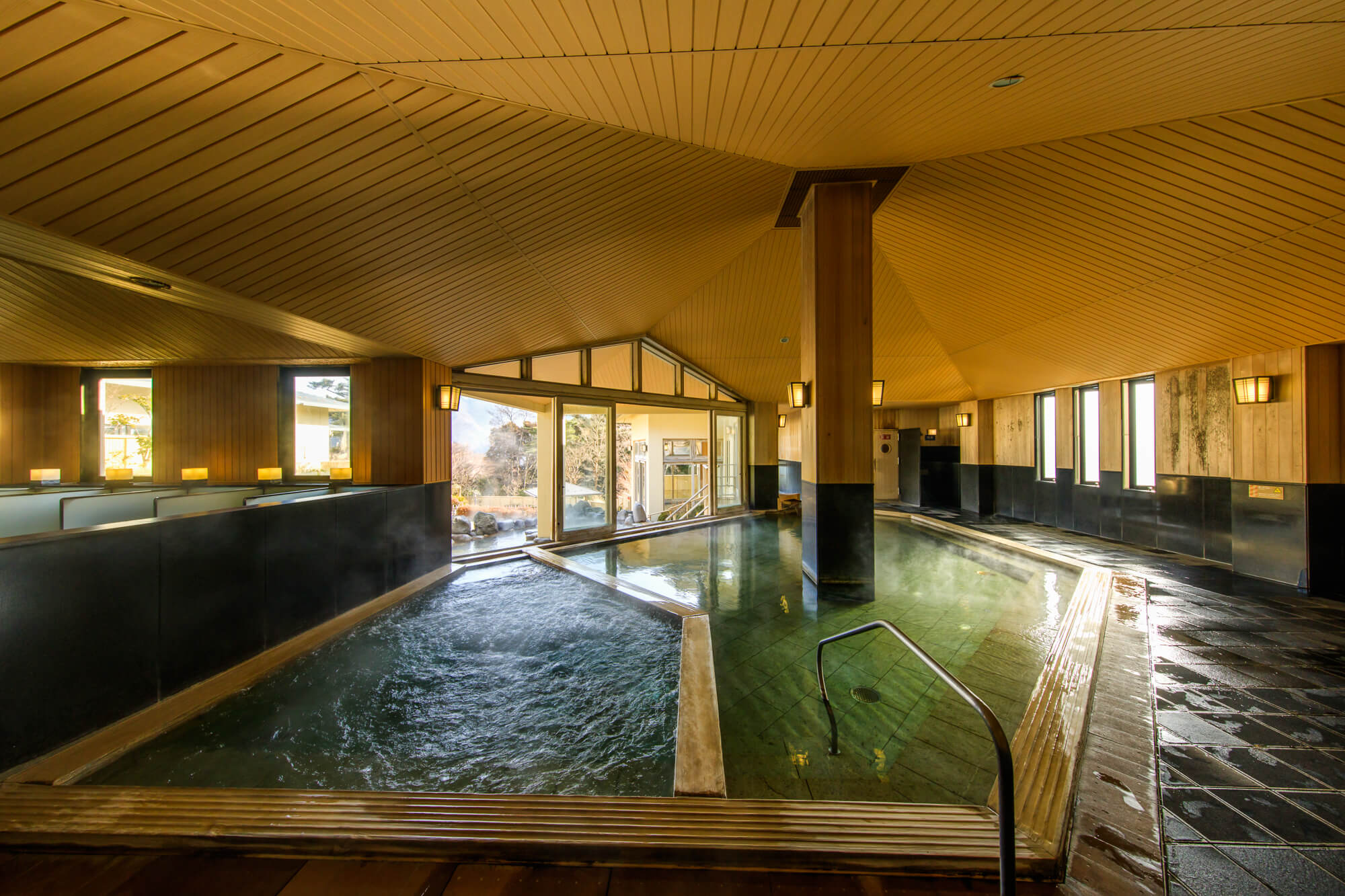 大浴場の内湯では、男性用・女性用ともに古材で組まれた太い梁や壁に貼られた墨色の杉板、大きなガラス窓に映る山の景色が落ち着いた雰囲気を醸し出しています。