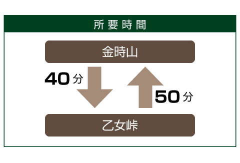 | アクセス | 金時山から登る場合 ・小田原駅から湖尻・桃源台行きバス47分「仙石」下車、金時山登り口へ 乙女峠から登る場合 ・小田原駅から湖尻・桃源台行きバス47分「仙石」下車、御殿場行きバス乗り換え5分 「乙女口」下車、乙女峠登り口へ |