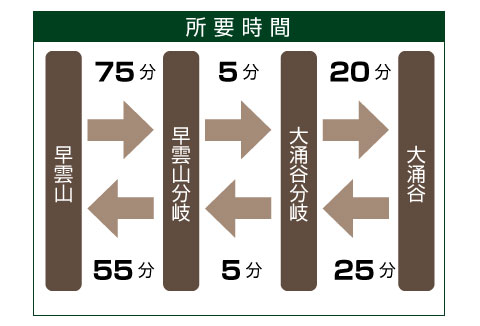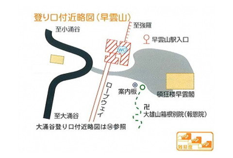 | アクセス | 早雲山からスタートする場合 ・小田原駅から「箱根湯本駅」乗り換え「強羅駅」下車(電車49分) ケーブルカー乗り換え9分「早雲山」下車 早雲山登り口へ ・小田原駅から大涌谷経由湖尻行きバス40分 「早雲山駅入口」下車、早雲山登り口へ 大涌谷からスタートする場合 ・小田原駅から大涌谷経由湖尻行きバス50分 「大涌谷」下車、大涌谷登り口へ |