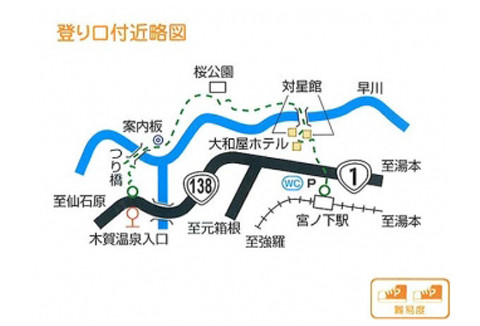 | アクセス | 宮ノ下駅から登る場合 ・小田原駅より電車「箱根湯本」駅下車 登山電車乗り換え「宮ノ下」駅下車 木賀温泉入口から登る場合 ・小田原駅より湖尻・桃源台行きバス38分 「木賀温泉入口」下車 |