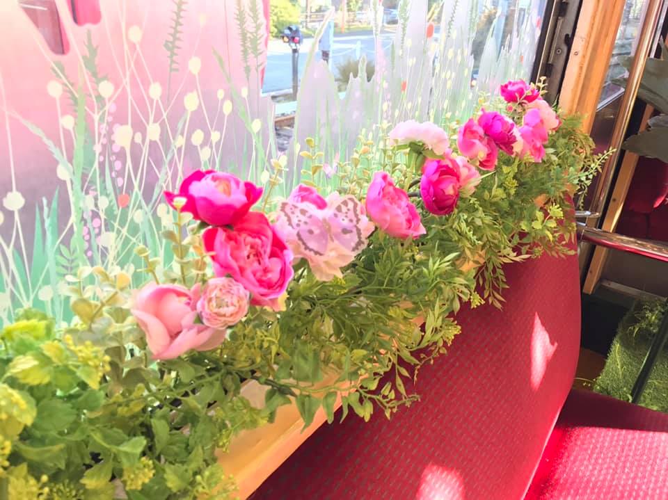 このイベントは強羅エリア活性化プロジェクト「HAKONE GO-LAND」の一環で、昨年の台風被害で運休し、強羅駅に停車している箱根登山電車の車内を花や緑、蝶々などで可愛く装飾したものです!