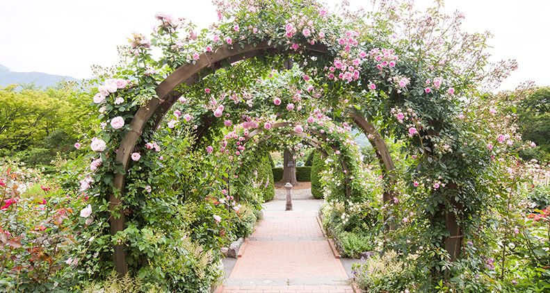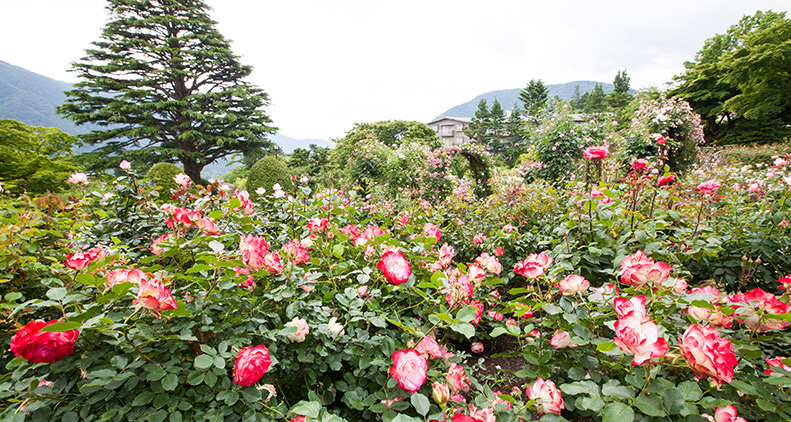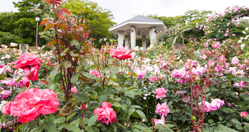 桜、ツツジ、アジサイと四季折々の花が楽しめる園内の中でも、その鮮やかさでひときわ目をひくのがローズガーデンのバラ。約140品種、1,000株のバラが植えられ、春の新緑、秋の紅葉とのコラボレーションも見事です。