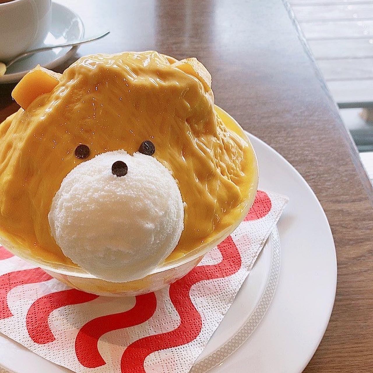 濃厚なマンゴーソースとヨーグルトソルベで作られた可愛いくまさんかき氷♪マンゴーラッシーのように甘く爽やかなので、暑いこの時期にはピッタリ!