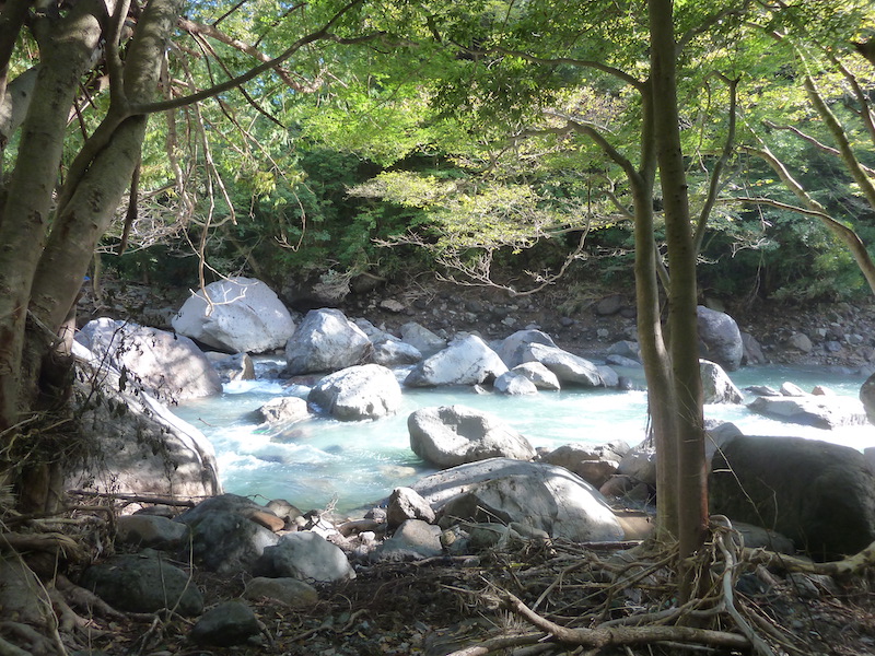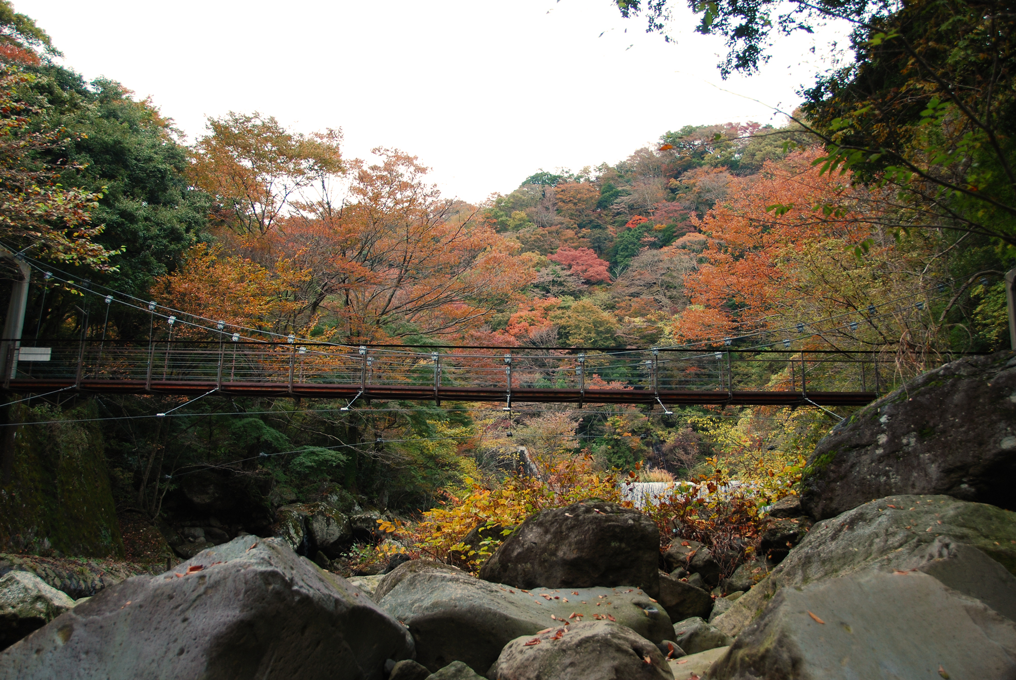 全長約1.5kmを1時間程度で歩けるハイキングコースで、緑と川のせせらぎに癒やされる。イギリスの学者チェンバレンが散策を楽しんだことでも知られ、11月中~下旬には渓谷沿いを染める紅葉が美しい。