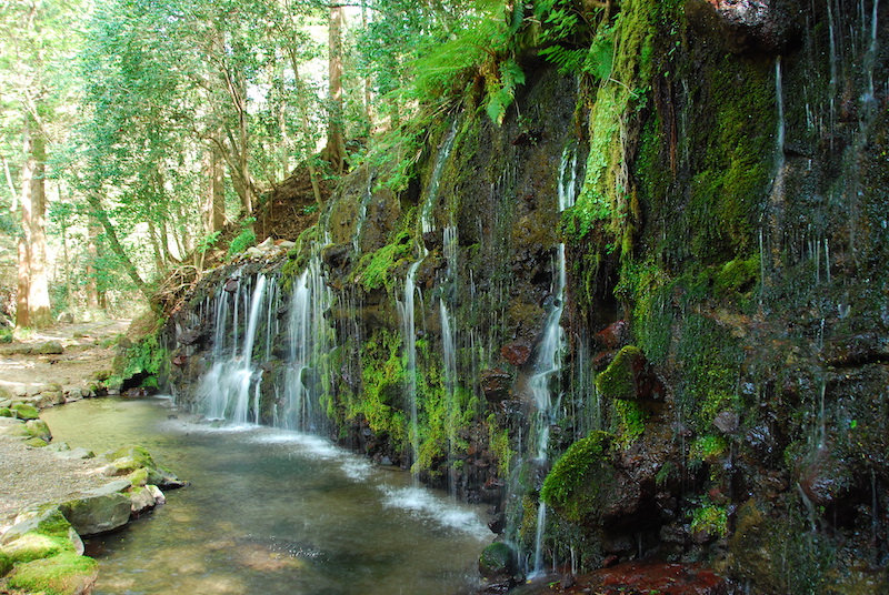 箱根小涌園蓬莱園から5、6分渓谷の方に下れば、千条(ちすじ)の滝にたどり着きます。切り立つ岩肌から細い糸状の滝が幾筋も流れ落ち、水量の豊富な季節には、その音とともに癒しを感じる風景が楽しめます。