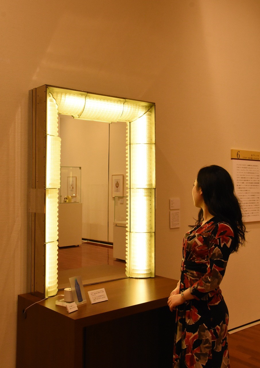 企画展に合わせ、フランスの芸術家ルネ・ラリックが手がけた鏡の中でも、最大級の作品を展示。アカシアの葉がデザインされたガラスパネルにあかりが灯り、見る人を美しく照らします。化粧をするように香りを纏った当時に想いを馳せ、再現した香水の香りとともにお楽しみください。