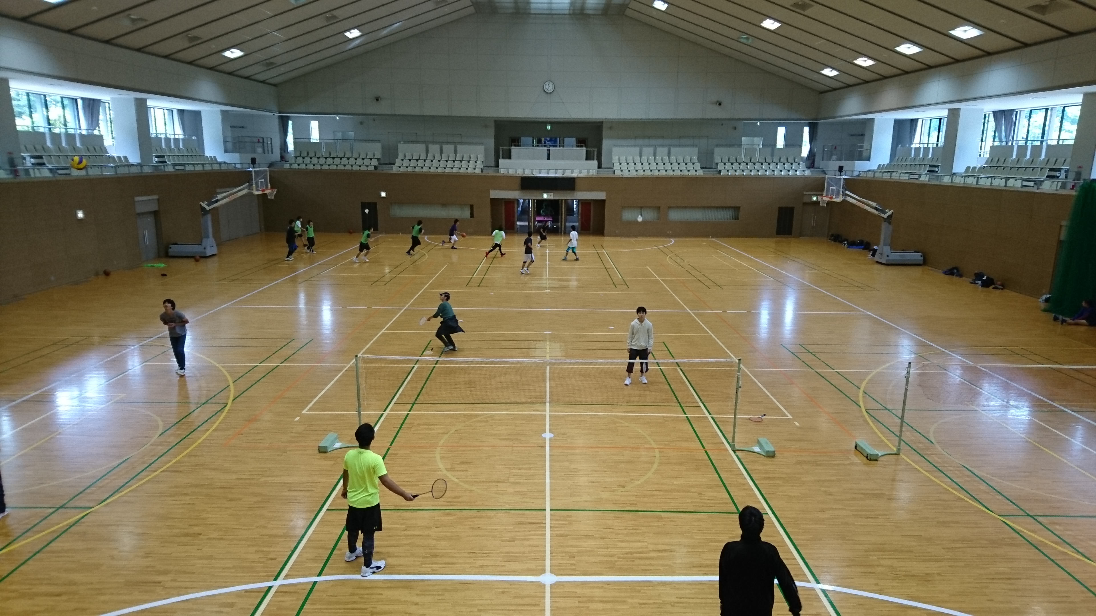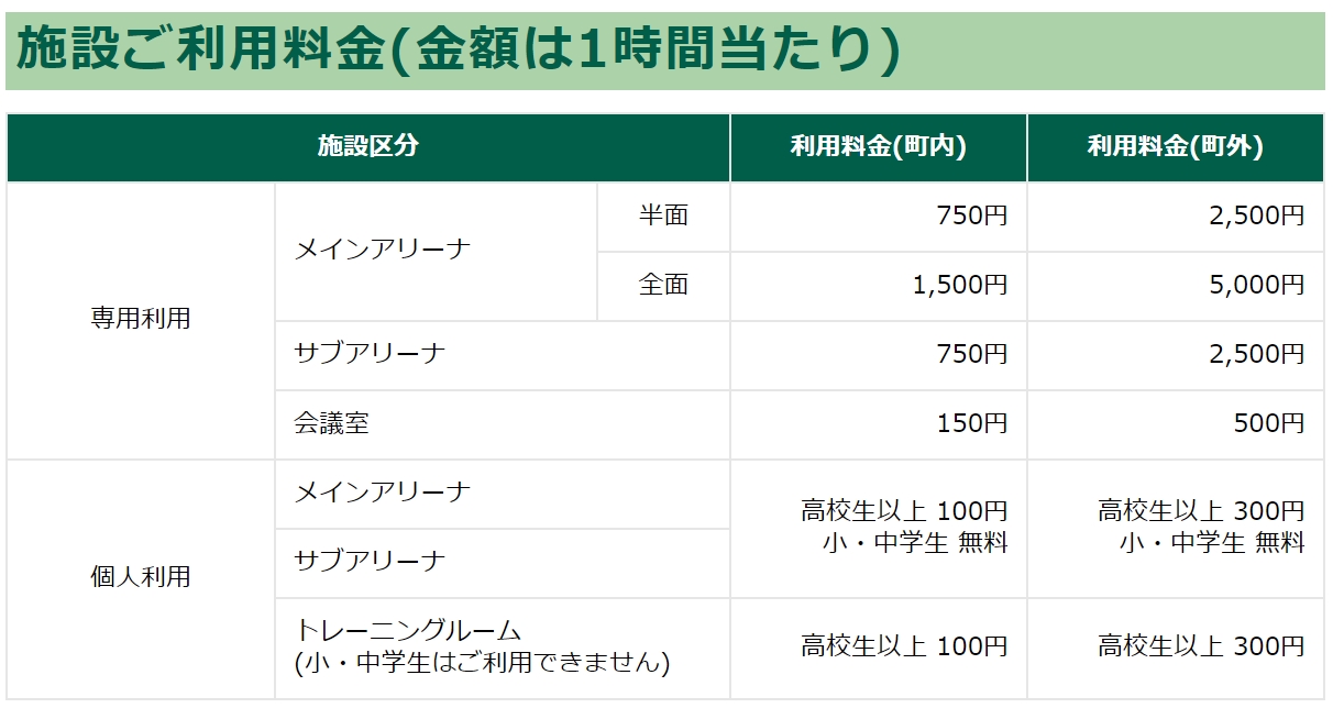 弊館では、メインアリーナ(42m×34m)、サブアリーナ(26m×16m)、会議室、トレーニングルームを設置しており、バスケットボール、フットサル、バレーボール、バドミントンといったスポーツから、マーチングバンド、研修等、様々な用途でご利用いただけます。