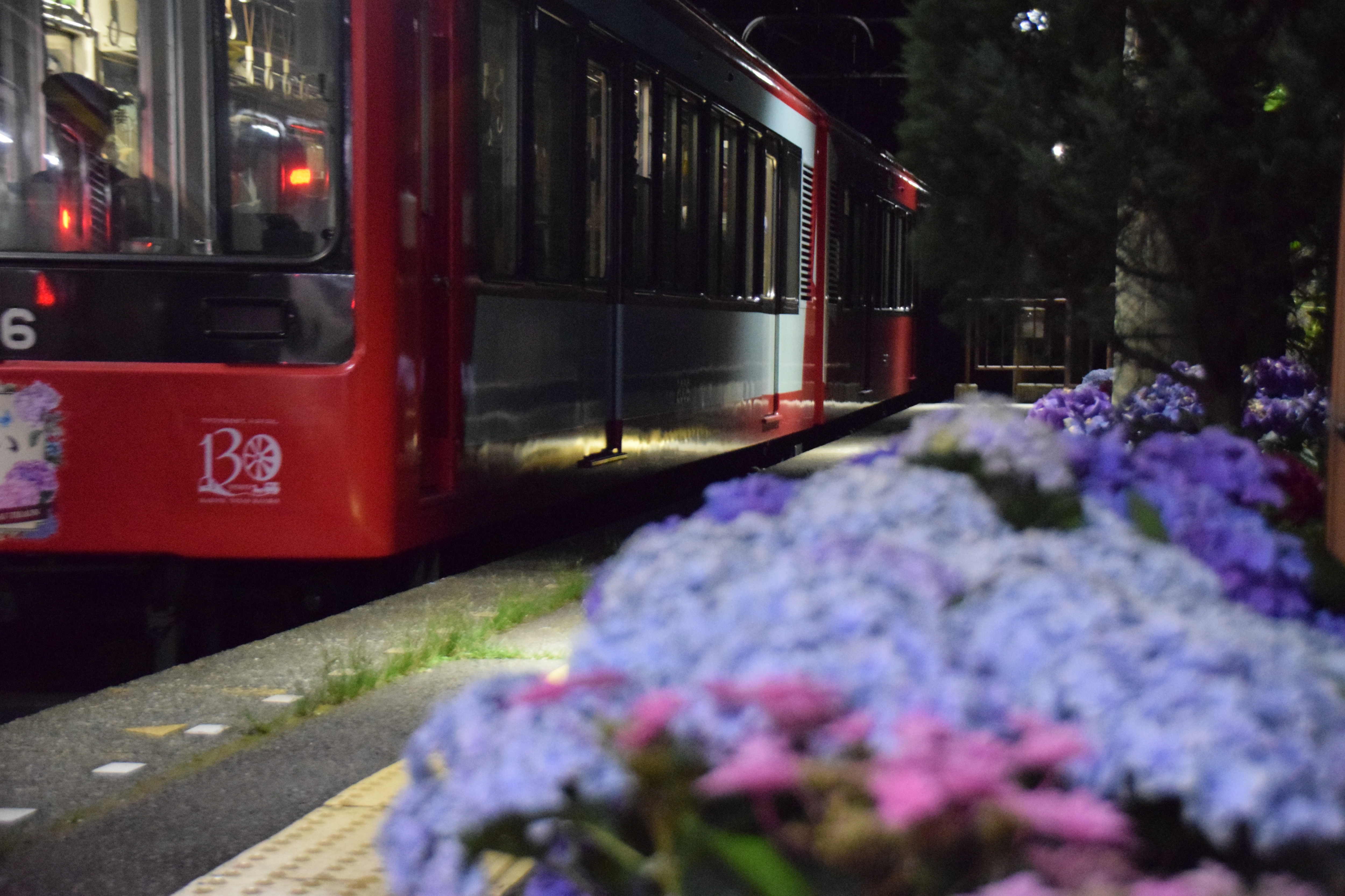 | アクセス | 沿線のあじさいを車窓から楽しんでいただく夜間ライトアップを2年ぶりに実施いたします。 昨年は、台風19号の被災により運休しておりましたが、 今年は日中の色鮮やかなあじさいと合わせて夜の幻想的な雰囲気をお楽しみいただけます。 なお、座席指定制の臨時電車からお楽しみいただく、初夏の箱根の風物詩「夜のあじさい号」につきま しては、新型コロナウイルスの状況を考慮し、2021年度の運転を休止いたします。 |