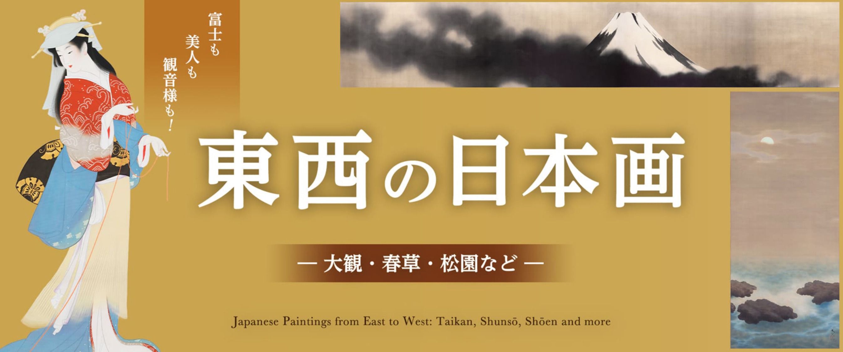 富士図の名手・横山大観(1868~1958)、美人画に専心した上村松園(1875~1949)と鏑木清方(1878~1972)、観音像を描き続けた村上華岳(1888~1939)。明治から大正、昭和にかけ、伝統と革新のはざまで新たな表現を模索した日本画家たちの作品は、色とりどりの魅力に満ちています。
