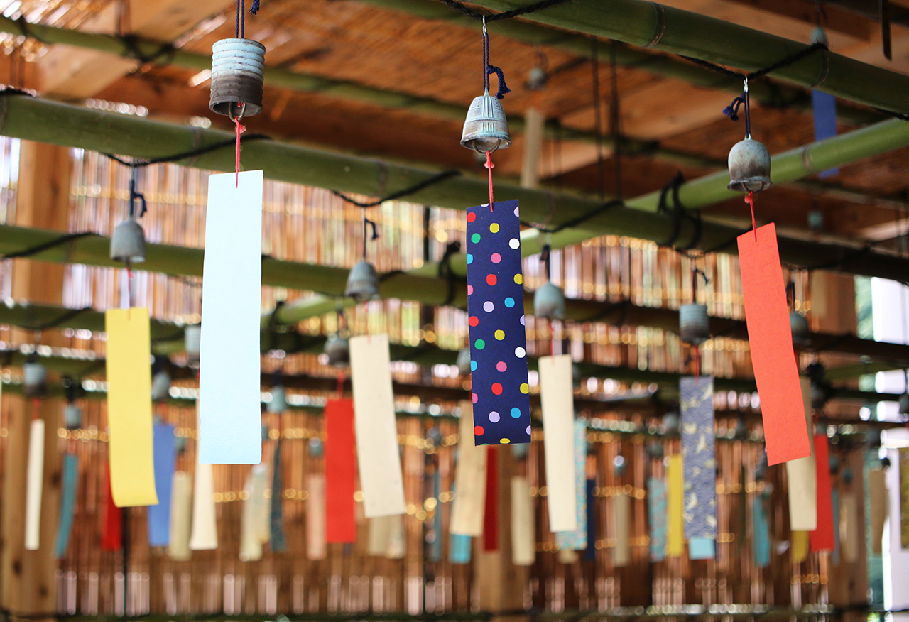 「箱根風鈴まつり」では4種類の形の風鈴(松虫・小田原提灯・鈴虫・釣鐘)を飾り付けています。形によってそれぞれ違う音色が織りなすハーモニーをお楽しみください。