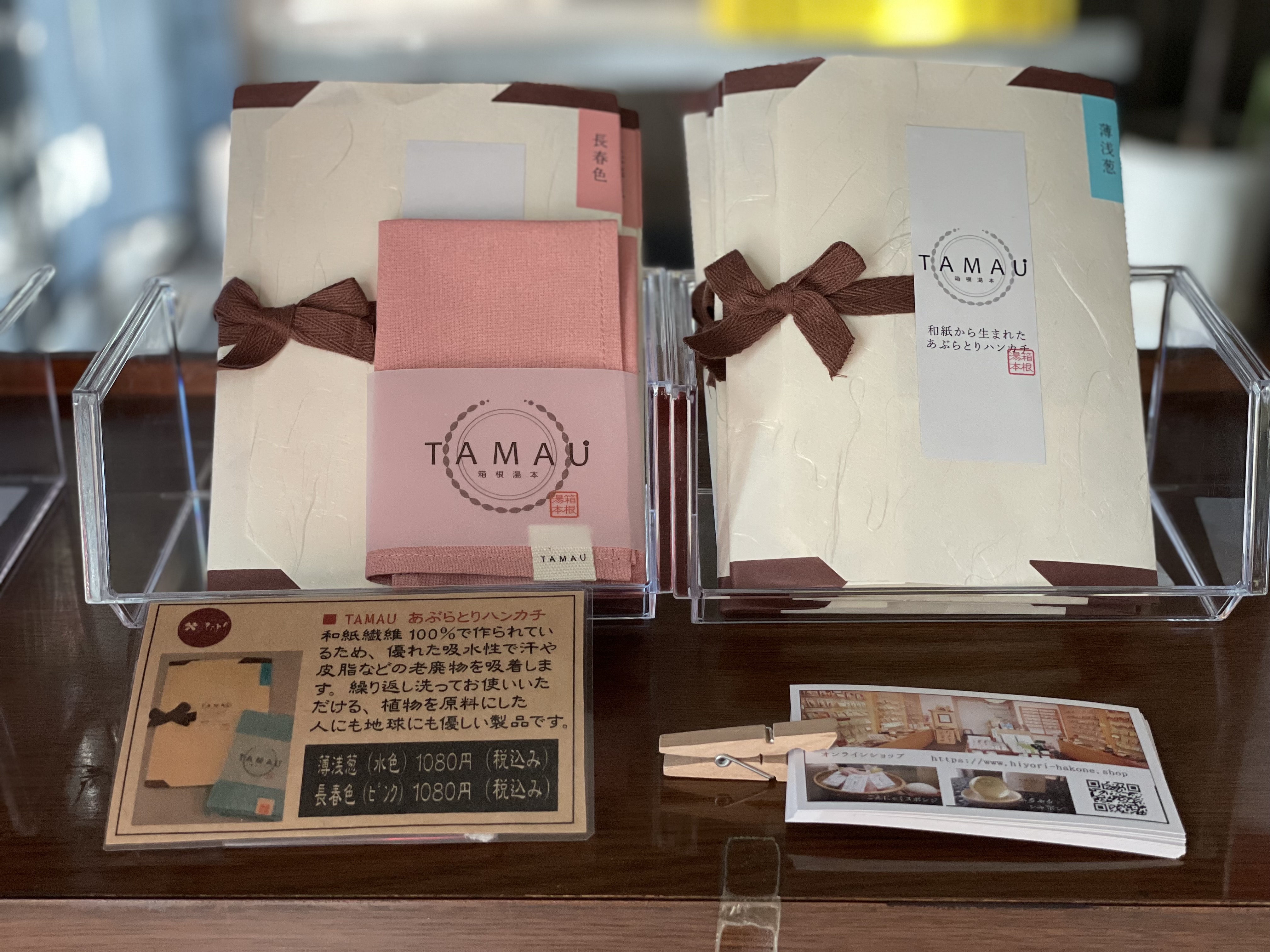 箱根湯本にあるあぶらとりがみの専門店「ひより」さんの美顔石鹸ふるふる金箔(ゴールド)1540円、華(ピンク)1650円とTAMAUあぶらとりハンカチ薄浅葱(水色)1080円、芳長春色(ピンク)1080円入荷しました。