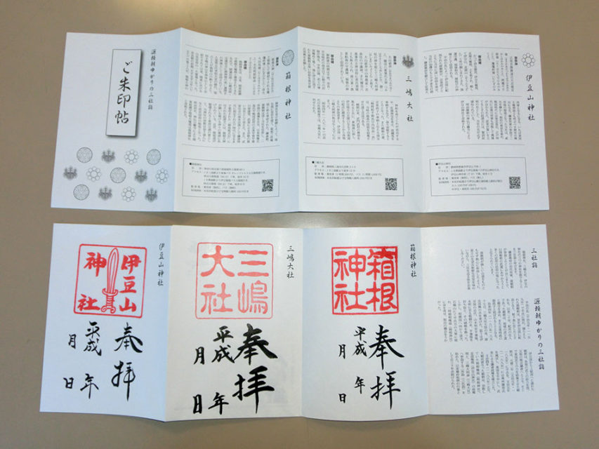 三社詣専用御朱印帖(200円)は、三島駅南口の三島観光案内所、三嶋大社、箱根神社お休み処「権現からめもち」などで販売しています。
