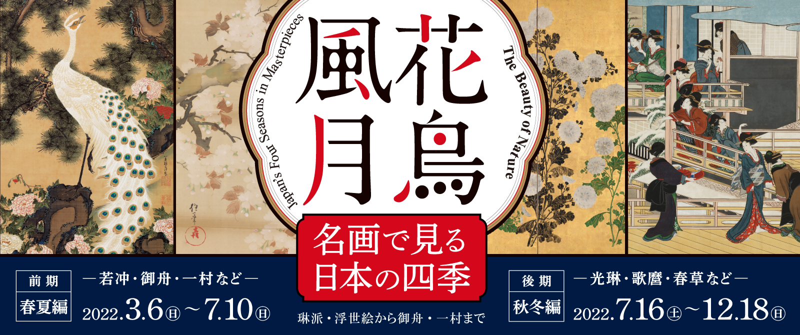 本展では、日本の絵画を中心に、陶磁や漆工などの工芸品を前・後期合わせて約100件展示し、四季がどのように表されてきたかをご紹介します。尾形光琳、酒井抱一ら琳派の作品、喜多川歌麿、葛飾北斎らによる浮世絵をはじめ、近代を代表する菱田春草や速水御舟、近年人気の高い伊藤若冲や田中一村の作品を交えながら、絵画の名作や工芸のデザインに見られる四季の美をお届けします。自然に囲まれた箱根の地で、四季折々の花や鳥を慈しむ、安らぎのひとときをお過ごしください。