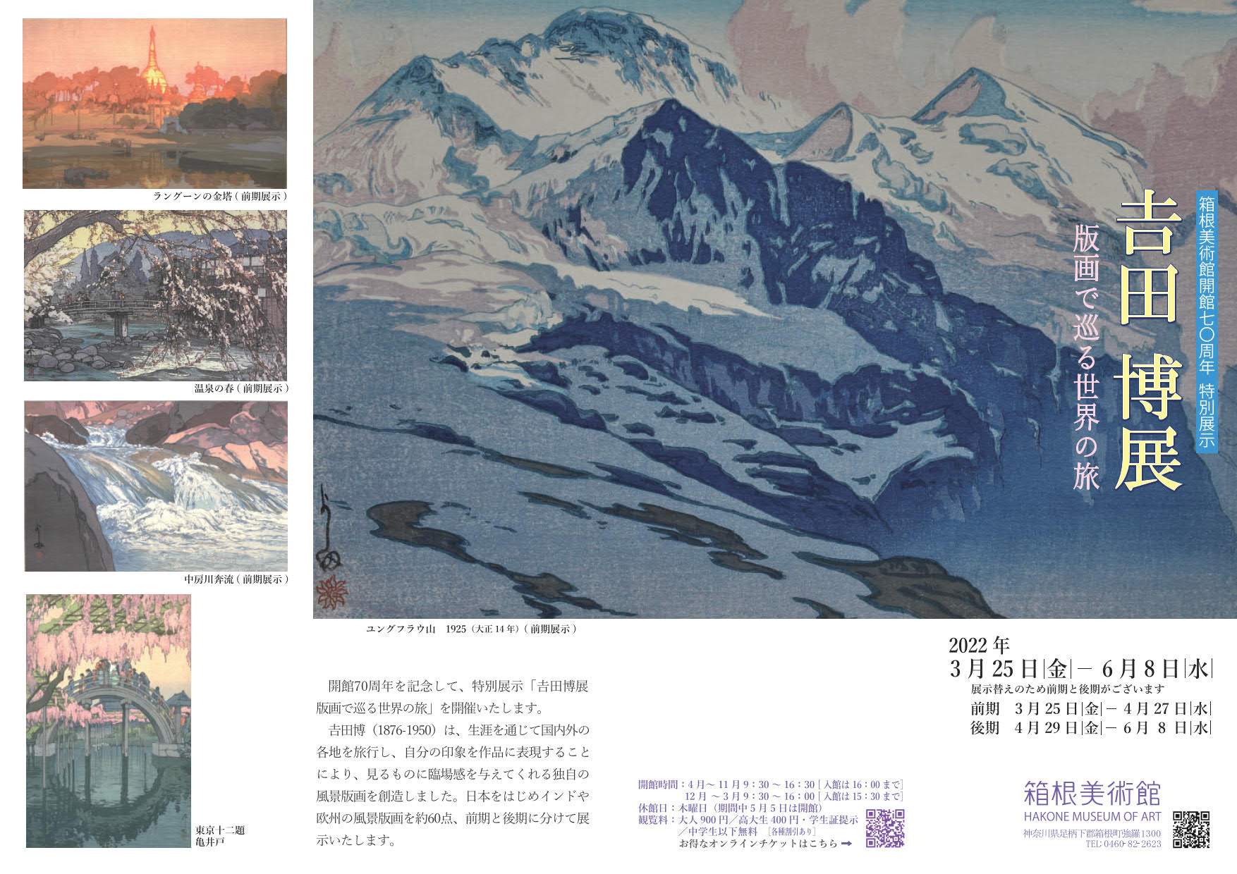 開館70周年を記念して、特別展示「吉田博展・版画で巡る世界の旅」を開催いたします。吉田博(1876-1950)は生涯を通じて国内外の各地を旅行し、自分の印象を作品に表現することにより、見る者に臨場感を与えてくれる独自の風景版画を創造しました。日本をはじめインドや欧州の風景版画を約60点、前期と後期に分けて展示いたします。