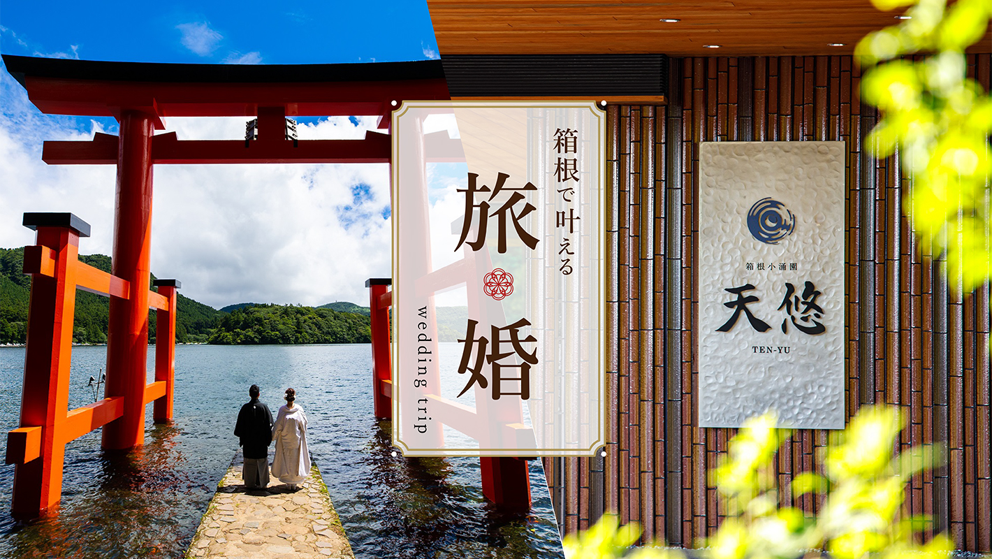 五感が癒される湯宿と箱根神社で家族の絆を大切にした箱根の旅婚。天悠開業5周年を記念して特別特典をご用意しました。神社での挙式、旅館での夕食、そのあとは温泉に入り、夜はみんなで想い出話をしながらゆっくりと過ごす。挙式~宿泊手配まで湘南プレミアムWeddingがサポート致します。