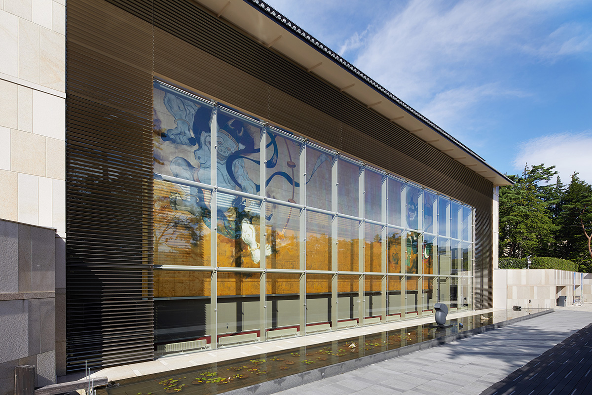 当館の正面を飾る風神・雷神の大壁画「風・刻」の前で、草月流の得意とする竹材と秋の花材をメインとしたいけばなを、解説を交えながら披露し、完成するまでの様子をお楽しみいただきます。