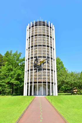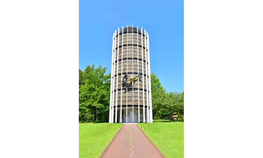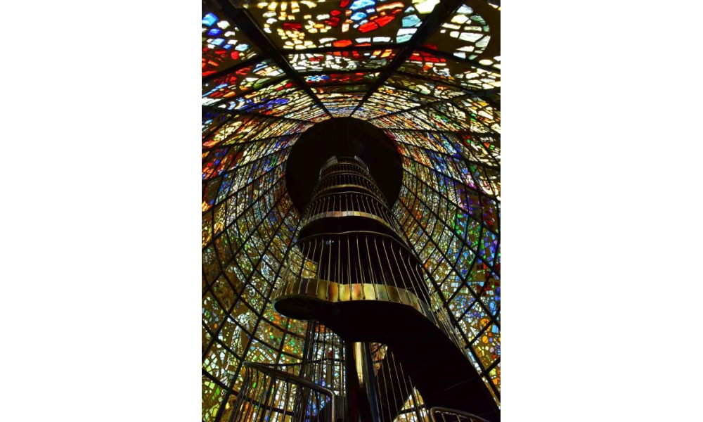 高さ18mのステンドグラスの塔、ガブリエル・ロアール《幸せをよぶシンフォニー彫刻》480枚のステンドグラスのパネルで