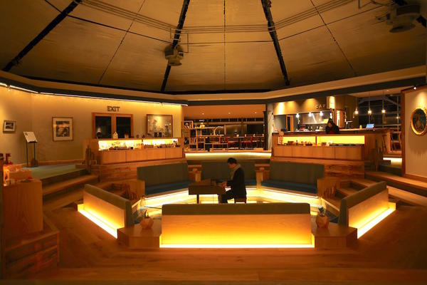 夕暮れ時の美術館内のティーラウンジでは淡いランプの灯りのむこうに芦ノ湖と富士山が浮かびあがり幻想的な時をお過ごしいただけます。(期間を限定して点灯)