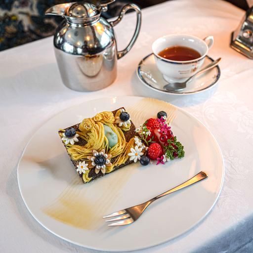 ラリックが制作したチョーカーヘッド「流れる髪の女」を模した「食べるアートスイーツ」。土台はサックリとしたサブレをチョココーティング、美しく流れる髪はモンブランで表現しました。