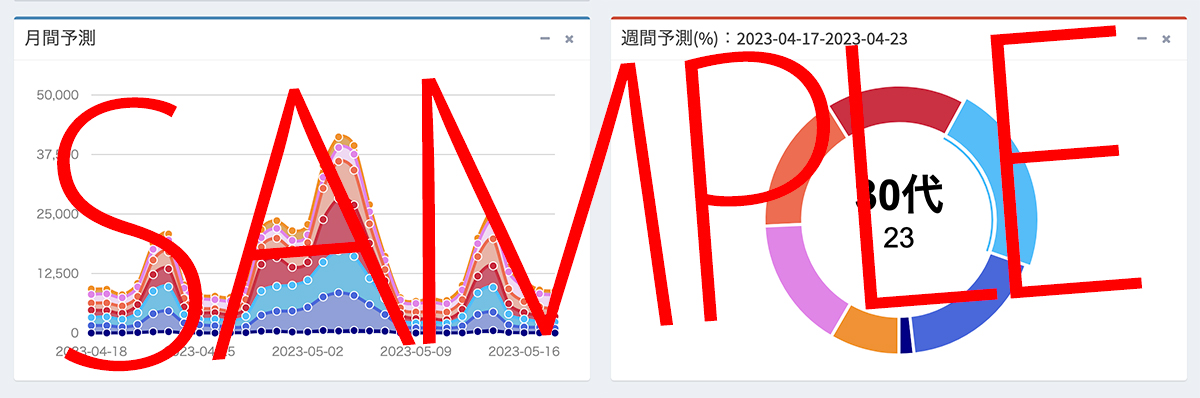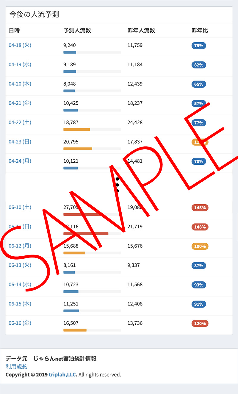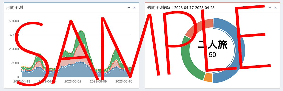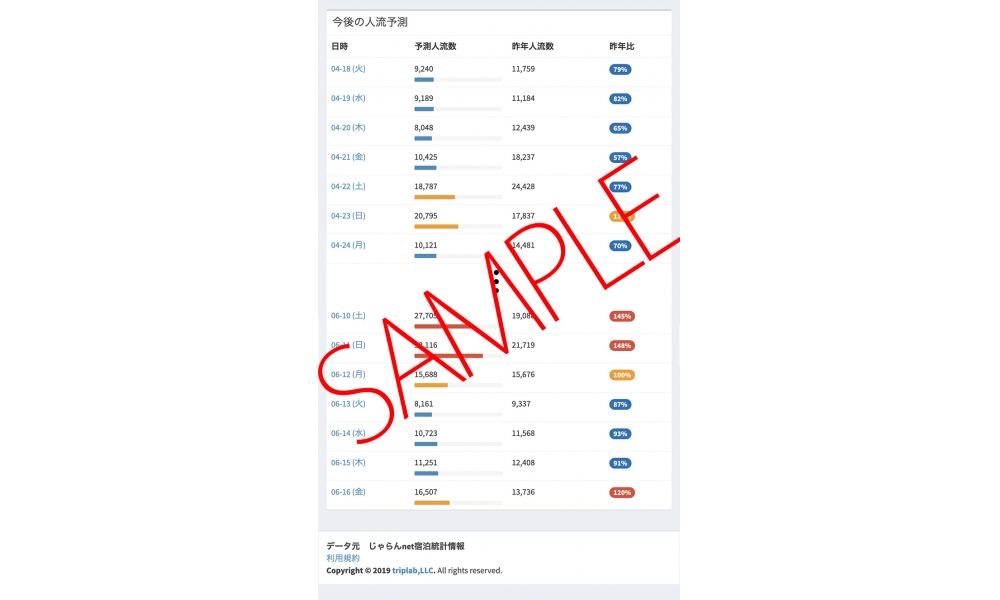 「じゃらんnet宿泊統計情報」(株式会社リクルート)と連携をすることで、1ヶ月先までの予約状況から人流予測、客層予測、年代予測の推移をグラフと数値で確認することが可能です。混雑予測日のシフトを手厚くしたり、客層や年代に合わせたおすすめ商品のご提案など幅広くご活用いただけます。