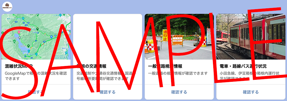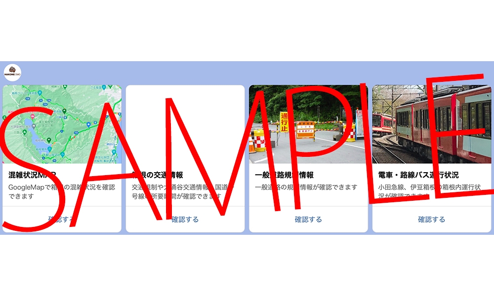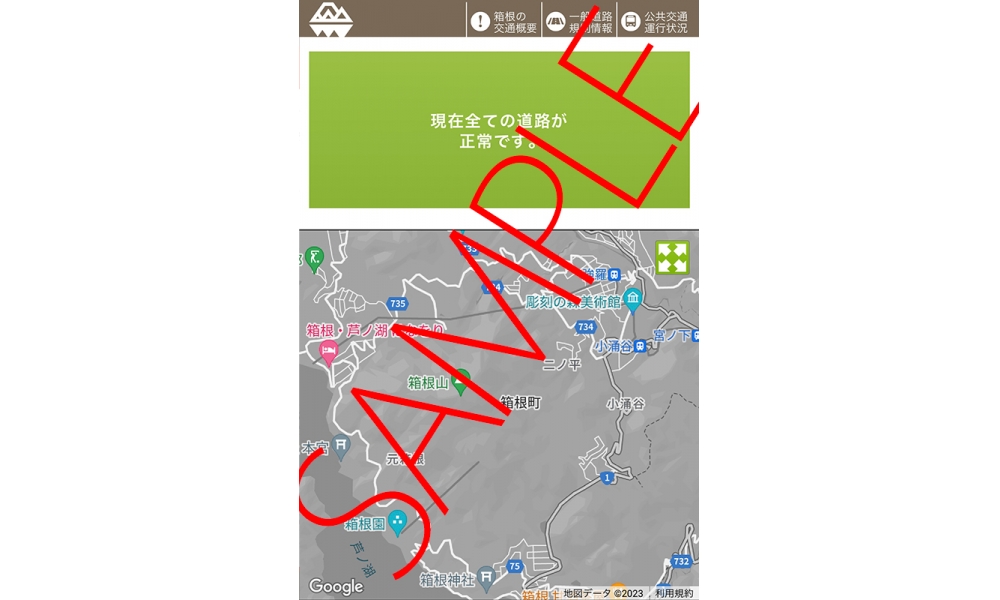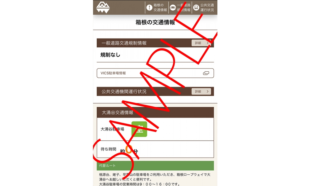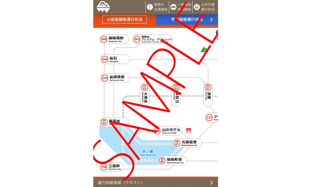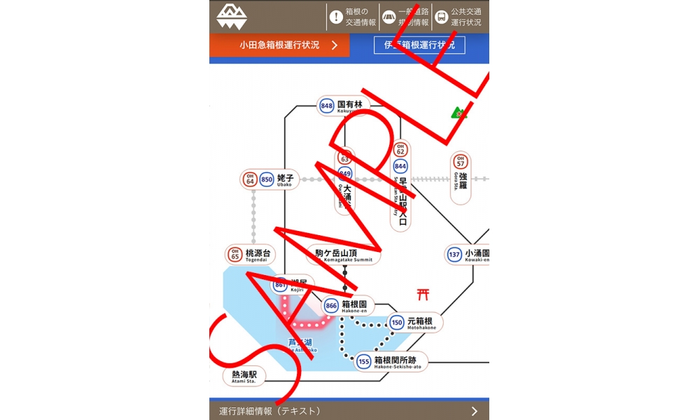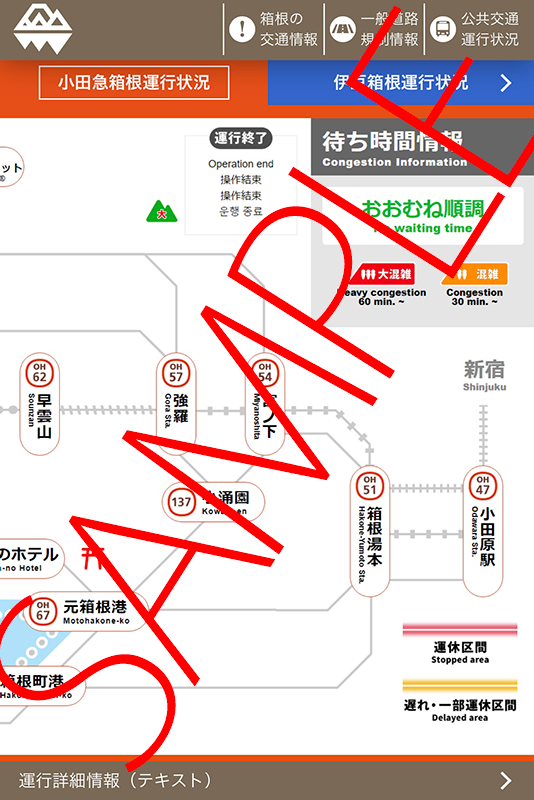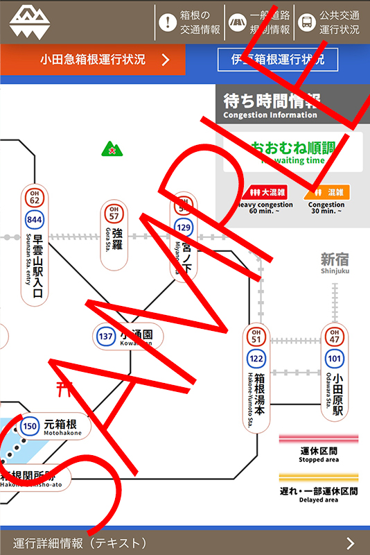 箱根全山で掲載している交通情報(箱根の交通情 報、一般道路規制情報、電車・路線バス運行状 況)に加え、新たに「混雑状況マップ」を追加した情報 をご覧いただくことができます。