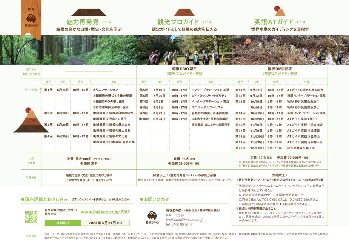 | 第1回:6月15日(木)10:00~16:00 ① 「箱根町の現状と今後の展望」 ② 「箱根DMOの取り組みとガイドに期待すること」 ③ 「箱根町における自然環境保全の取り組み」 ④ 「本講習会の全体の今後の流れ」 |