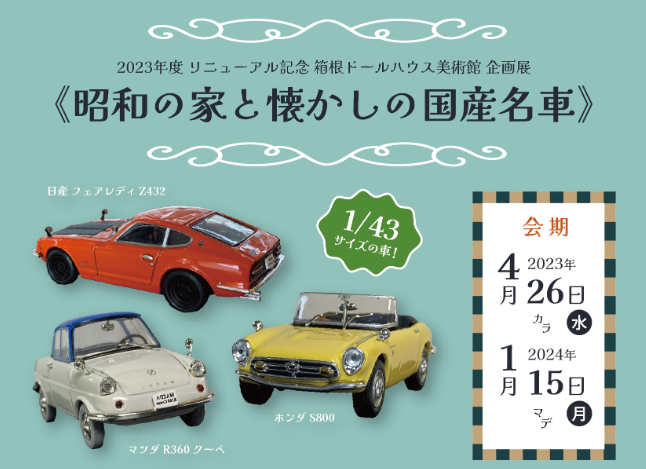 『昭和の家と懐かしの国産名車』と題した企画展では、1/43スケールのミニチュアカーとともに、古き良き昭和の時代を彷彿とさせるドールハウスが集結します。