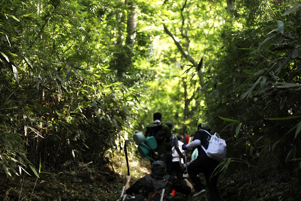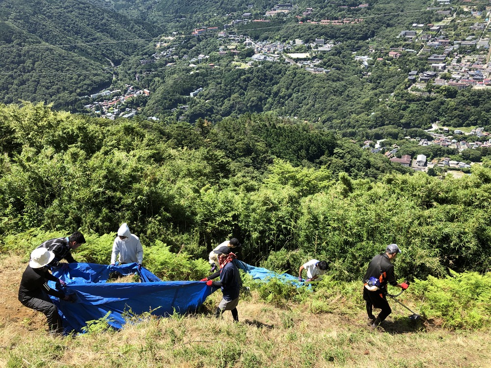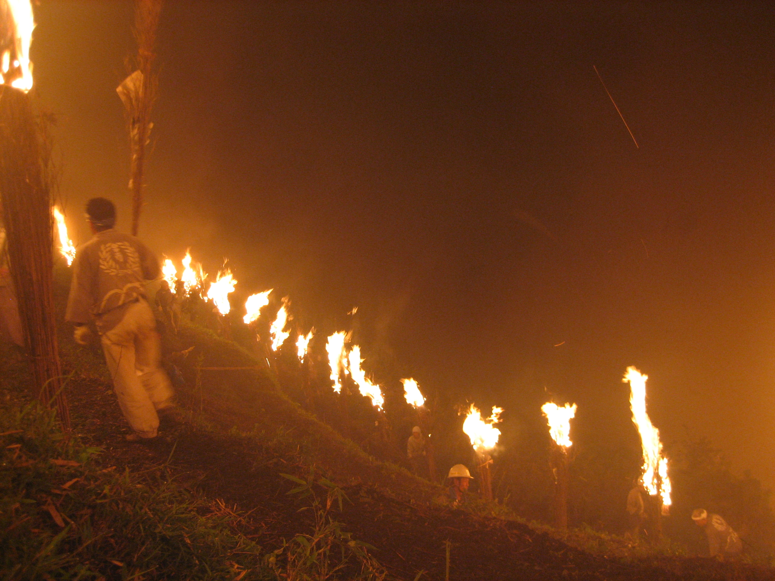 二ヶ月も前より炎天下の山腹に於いて、刈取り、乾燥の作業が繰り返されます。乾燥した篠竹(箱根女竹長さ3m 程)を直径30cm程の束として250 束作ります。「大」の字が大きく描かれる様、「大」の輪郭に沿って二重にし、約1.5m間隔に立てます。一筋の花火を合図に点火され、点が線となり文字となって皆様の眼前に「大」の字が浮かんでまいります。(「大」の字の「一」は長さが108m、文字の太さは7.5m にもなります。) 最後に、来る年、来る年、より大きく!美しく!という願いを胸に、お互い励まし合いながら汗を流し、黙々と準備を重ね、当日は暗黒の急斜面に身を躍らせて、灼熱の熱風を浴びながら「大」の字を作る80余名の宮城野青年会の努力があることを申し添えます。