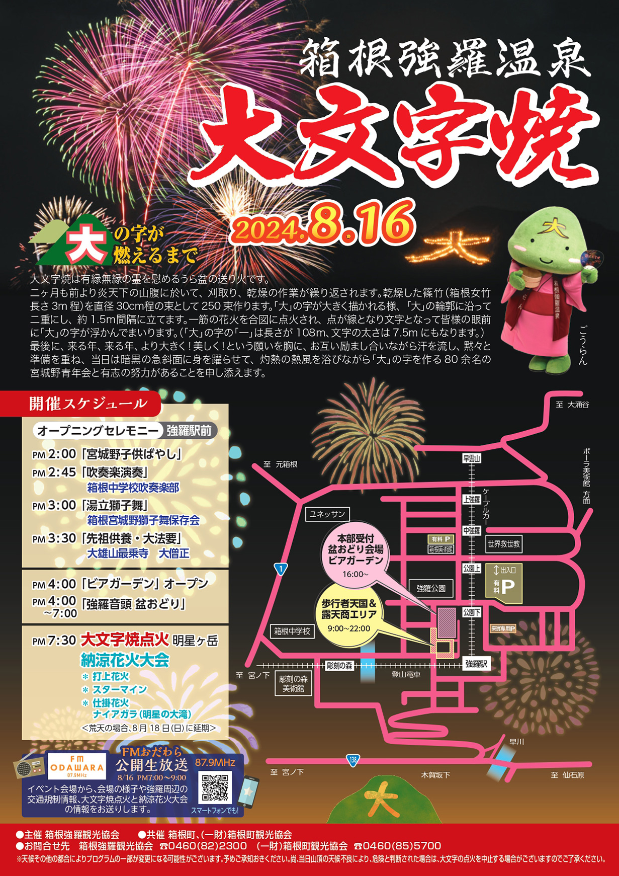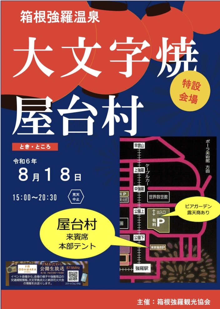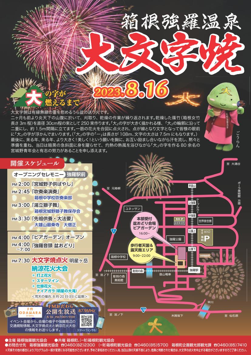 | 内容 | 14:00 宮城野子供ばやし 14:45 吹奏楽演奏 15:00 湯立獅子舞 15:30 先祖供養・大法要 16:00 「ビアガーデン」オープン 16:00~19:00 強羅音頭 盆おどり 19:30 大文字点火・納涼花火大会 ※開会式、イベントは中止いたします。(オープニングセレモニーの吹奏楽・獅子舞・宮城野子どもばやし 盆踊り) ※なお、15:30からの先祖供養・大法要は15:00に変更いたしました。大文字焼、花火、ナイアガラは19:30より実施いたします。 |