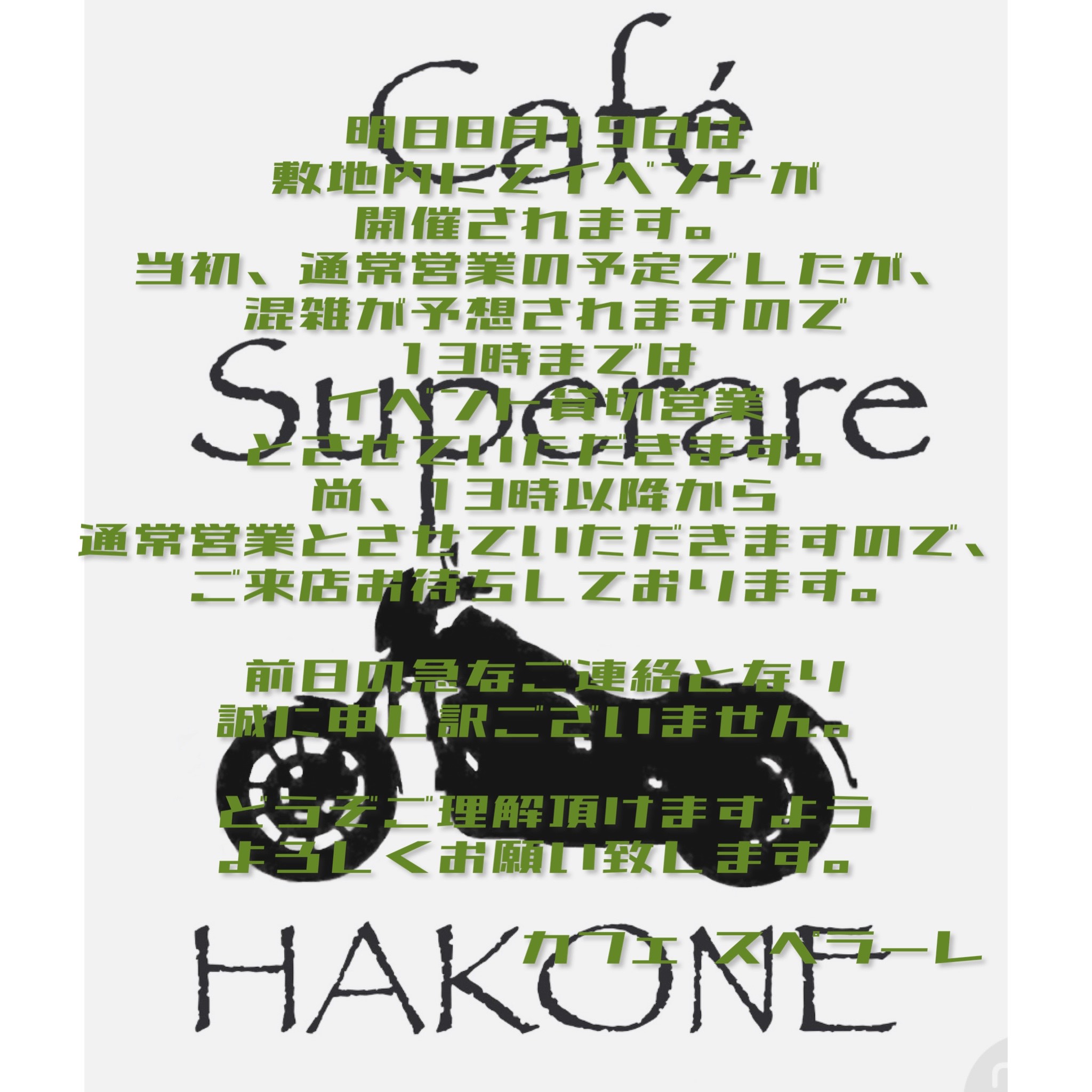 8月19日営業時間変更のお知らせ(カフェ スペラーレ)