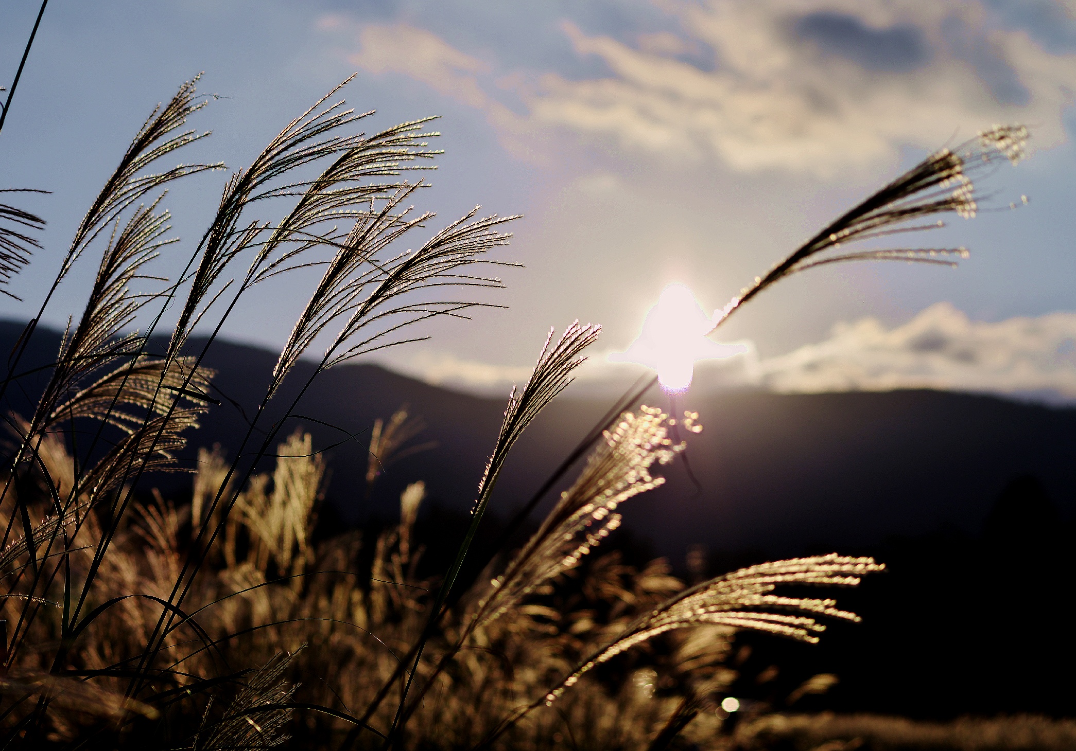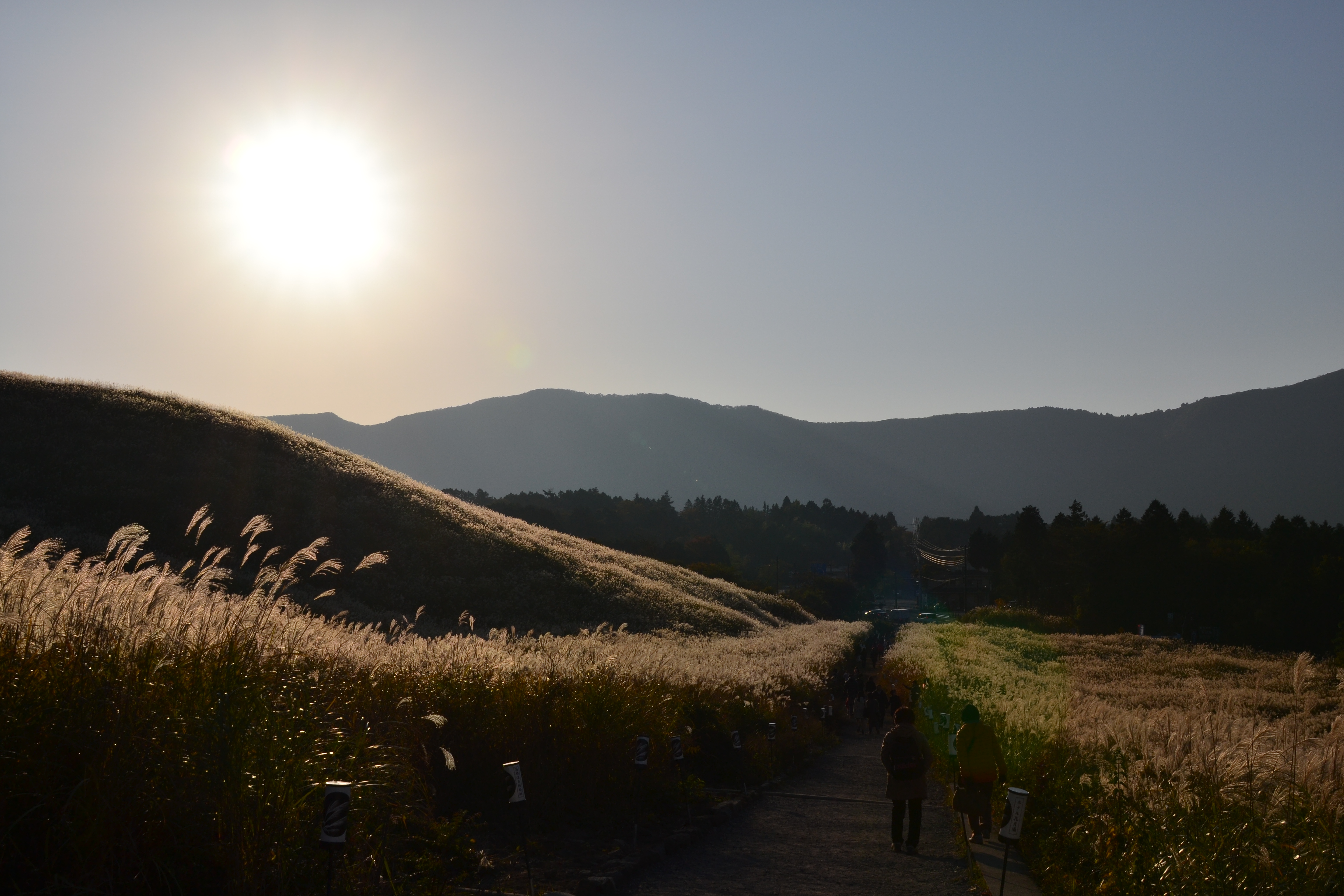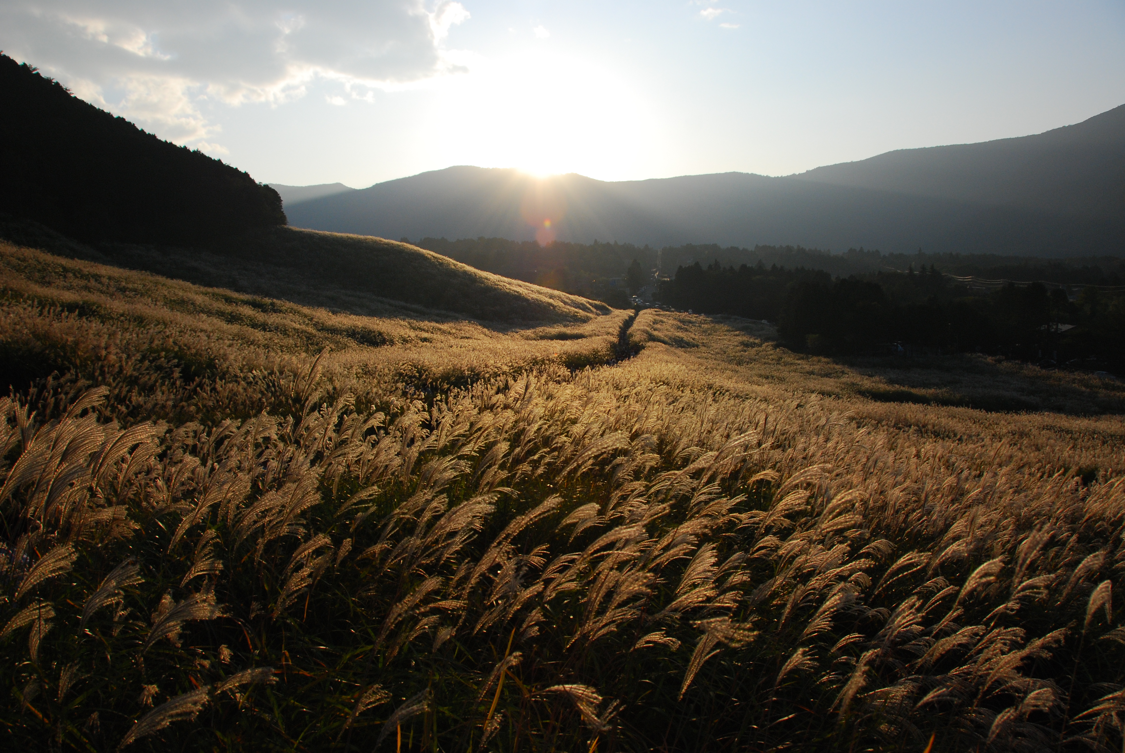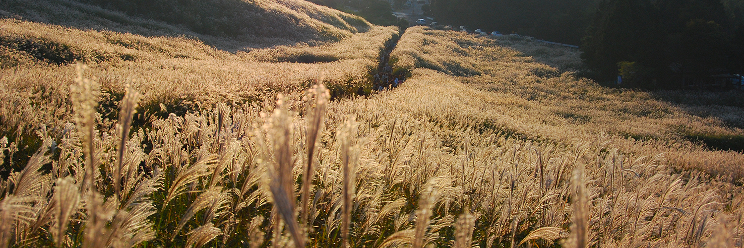 すすき草原は見頃を迎える秋以外にも、実は季節毎に見所がたくさん。美しさを保つため初春には山焼きが行われ、夏の間に見事な緑の絨毯をつくり、秋には銀色の穂が風に揺れ、10~11月にかけて山裾が徐々に黄金色から銀色に染まって行くのがゆっくりと楽しめます。