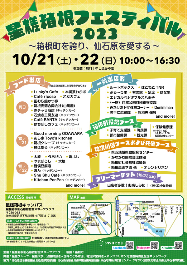 星槎箱根フェスティバルは昨年度から再開し、2日間とも大盛況のイベントとなりましたが、今年度は地元仙石原を盛り上げたいという想いから、『箱根町を誇り、仙石原を愛する』『未来あるまち作り』をコンセプトとして、毎年共催いただいている『仙石原飲食店組合』様に加えて『仙石原自治会連合会』様と『仙石原商店会』様にもご協力いただけることになり、地元飲食店やキッチンカー、マッサージ、本、フリーマーケットに町役場ブースなど盛りだくさんです。